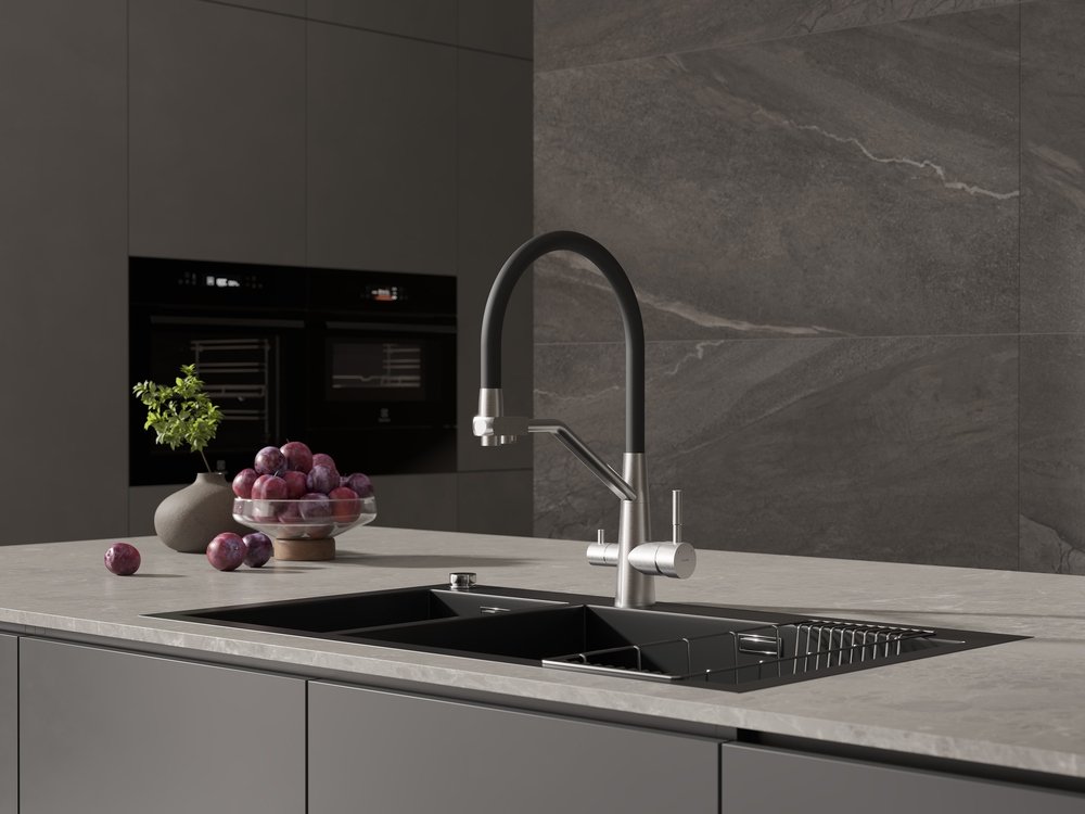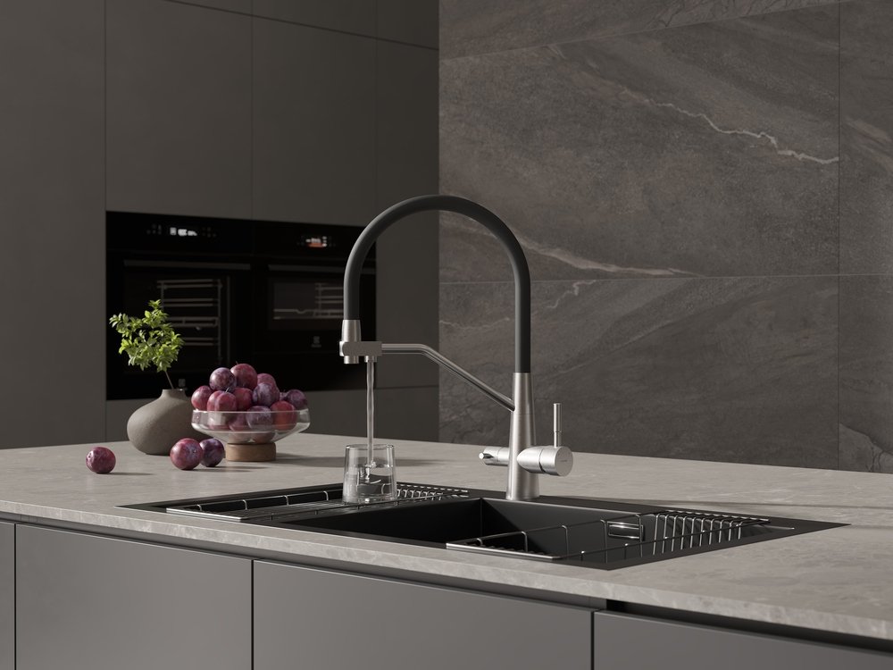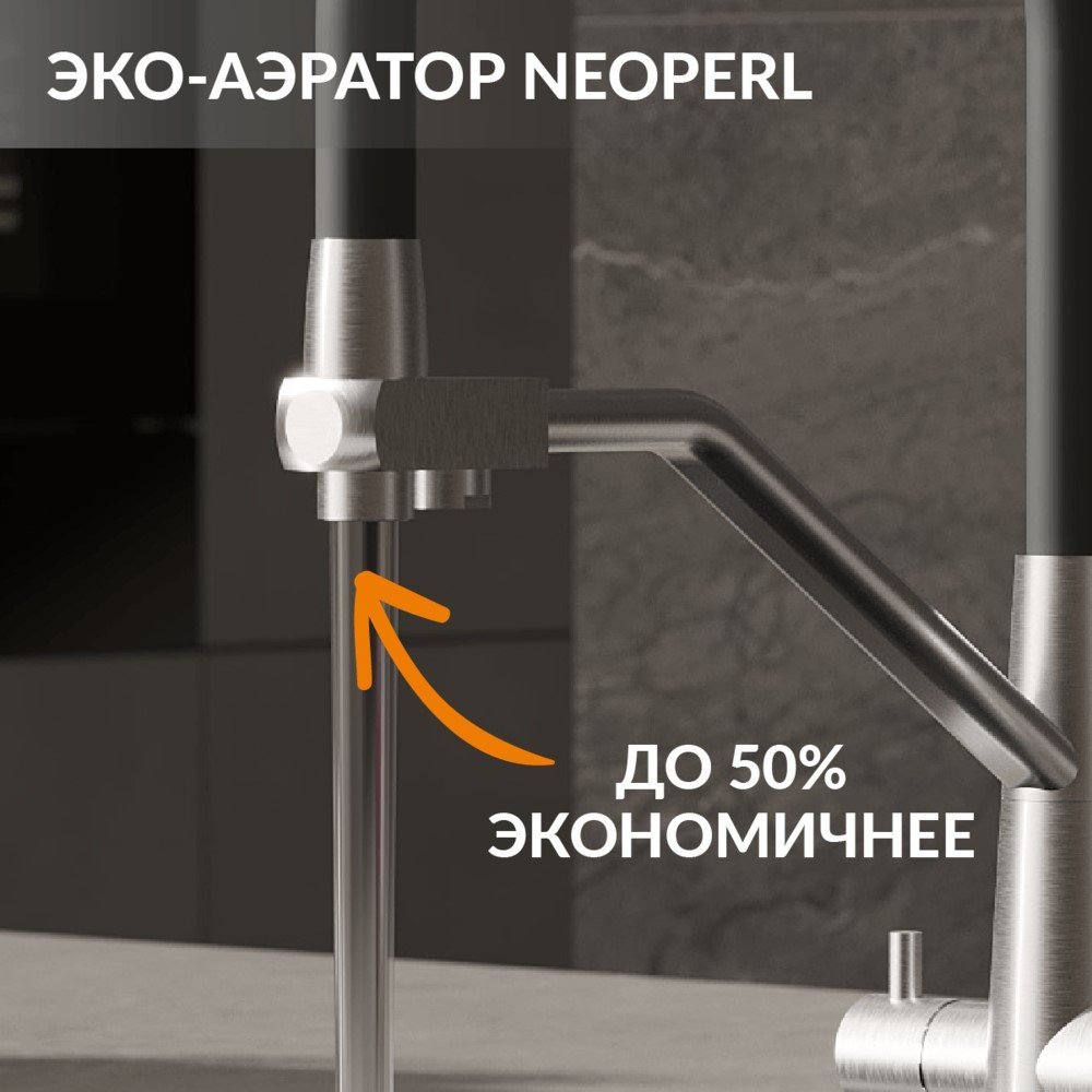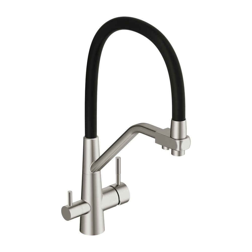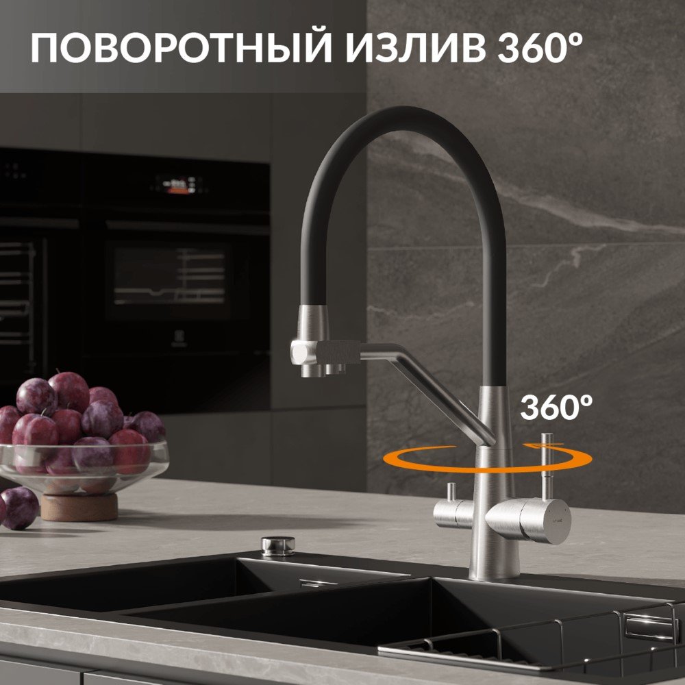Смесители Vivo стали воплощением лучших технических идей, цель которых — сделать нашу жизнь комфортнее. Модель с необычным дизайном выгодно дополнит любую кухню, от классической до лофтовой или хайтека. Два отдельных излива под проточную и фильтрованную воду решат бытовые задачи. Смеситель оснащен гибким изливом из термостойкого силикона. Материал нетоксичен, а потому безопасен для использования на кухне. Выполненный из качественных материалов, он обладает повышенной износостойкостью и устойчивостью к перегибам. Отдельный излив предусмотрен под фильтрованную воду. Смеситель оснащен системой с двумя ручками. Одна включает проточную воду, а вторая — проточную. Внутри излива расположен аэратор Neoperl.