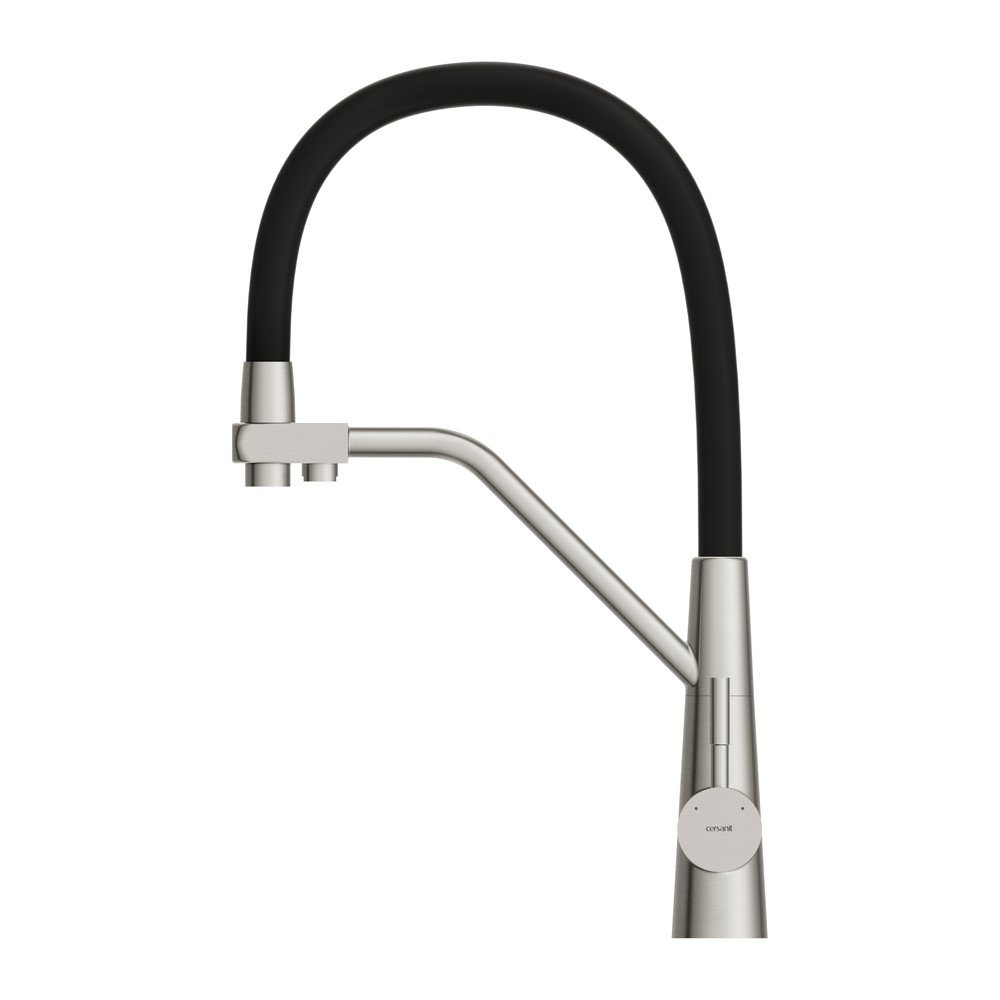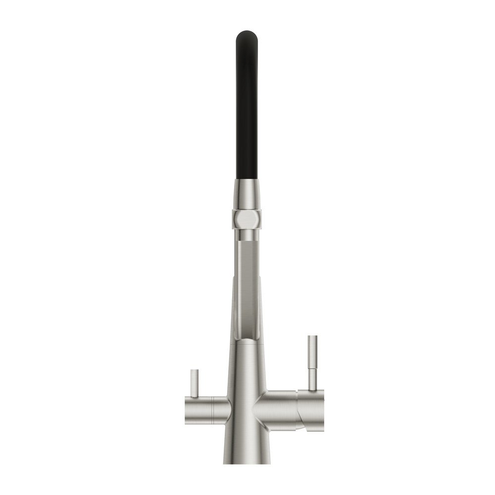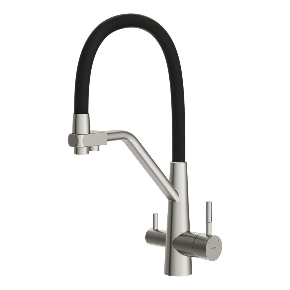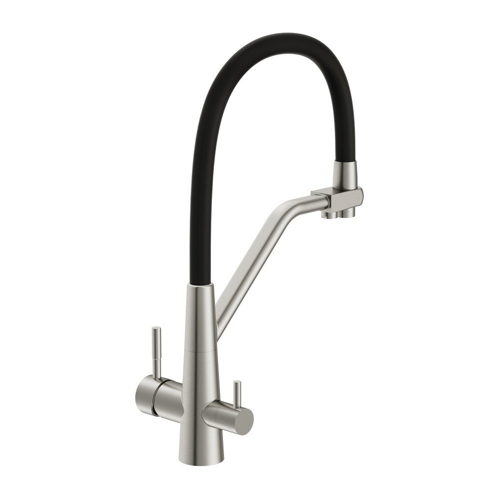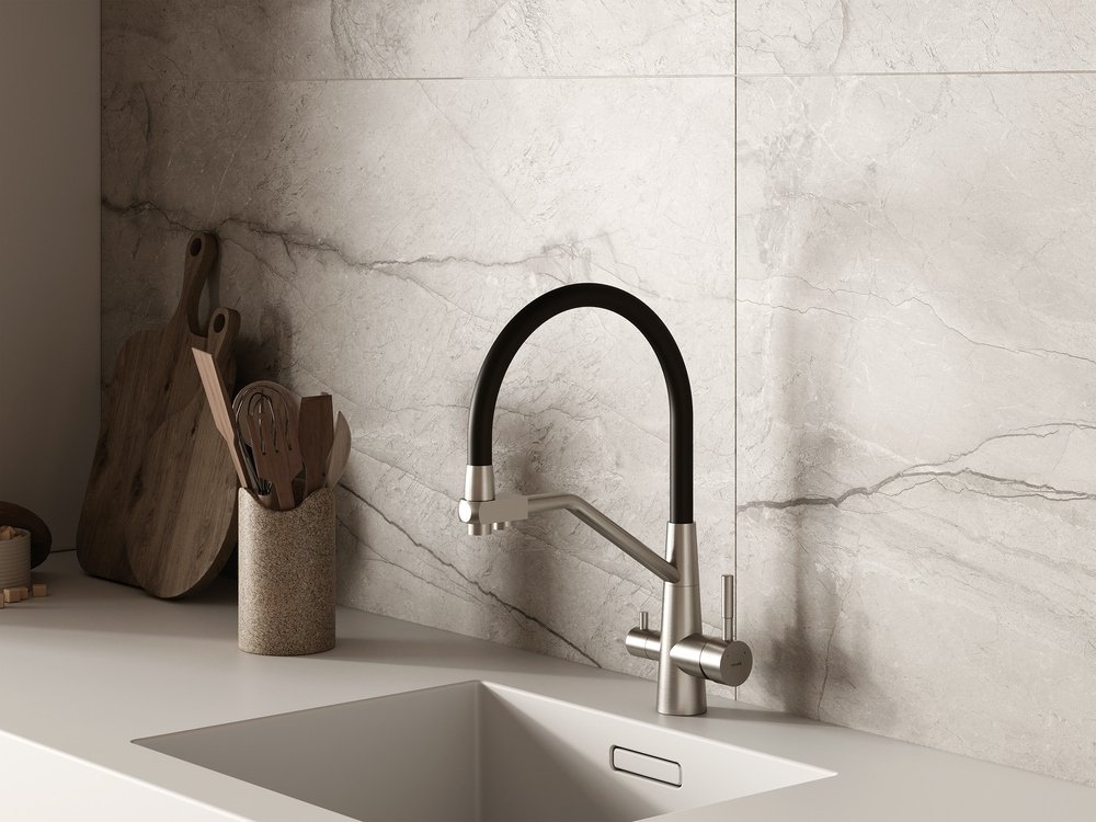 Смесители Vivo стали воплощением лучших технических идей, цель которых — сделать нашу жизнь комфортнее. Модель с необычным дизайном выгодно дополнит любую кухню, от классической до лофтовой или хайтека. Два отдельных излива под проточную и фильтрованную воду решат бытовые задачи. Смеситель оснащен гибким изливом из термостойкого силикона. Материал нетоксичен, а потому безопасен для использования на кухне. Выполненный из качественных материалов, он обладает повышенной износостойкостью и устойчивостью к перегибам. Отдельный излив предусмотрен под фильтрованную воду. Смеситель оснащен системой с двумя ручками. Одна включает проточную воду, а вторая — проточную. Внутри излива расположен аэратор Neoperl.
