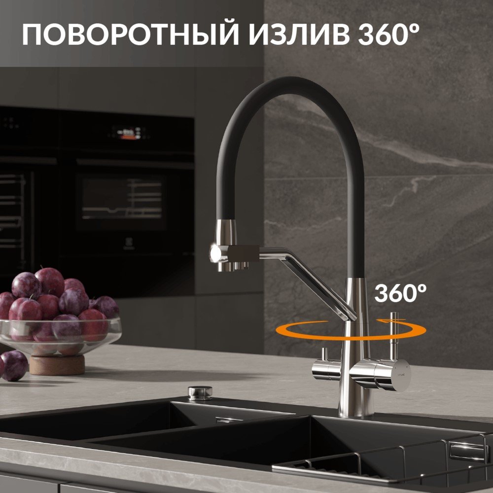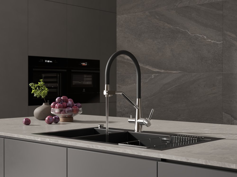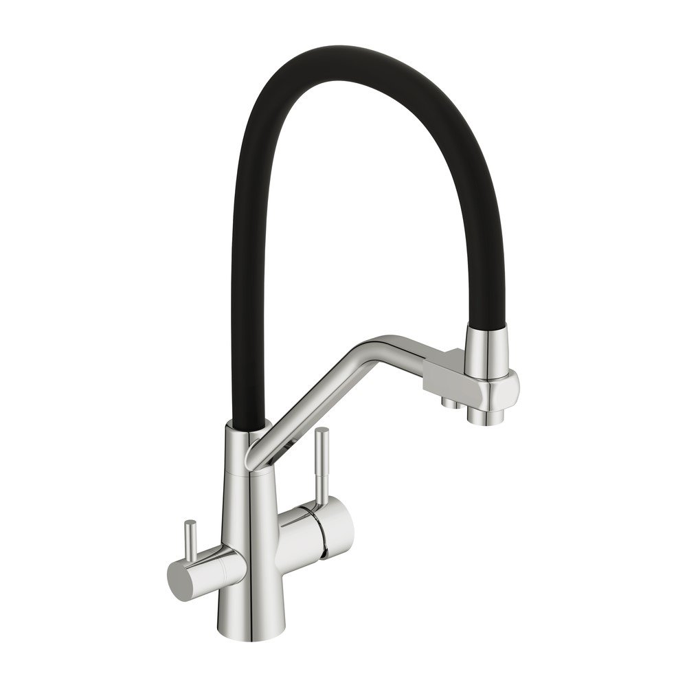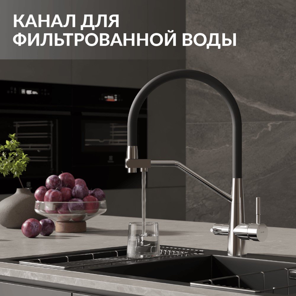 Смесители Vivo стали воплощением лучших технических идей, цель которых — сделать нашу жизнь комфортнее. Модель с необычным дизайном выгодно дополнит любую кухню, от классической до лофтовой или хайтека. Два отдельных излива под проточную и фильтрованную воду решат бытовые задачи. Смеситель оснащен гибким изливом из термостойкого силикона. Материал нетоксичен, а потому безопасен для использования на кухне. Выполненный из качественных материалов, он обладает повышенной износостойкостью и устойчивостью к перегибам. Отдельный излив предусмотрен под фильтрованную воду. Смеситель оснащен системой с двумя ручками. Одна включает проточную воду, а вторая — проточную. Внутри излива расположен аэратор Neoperl.