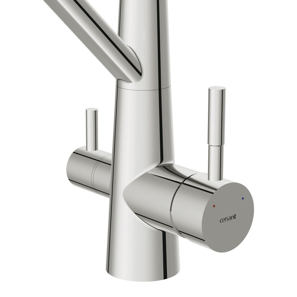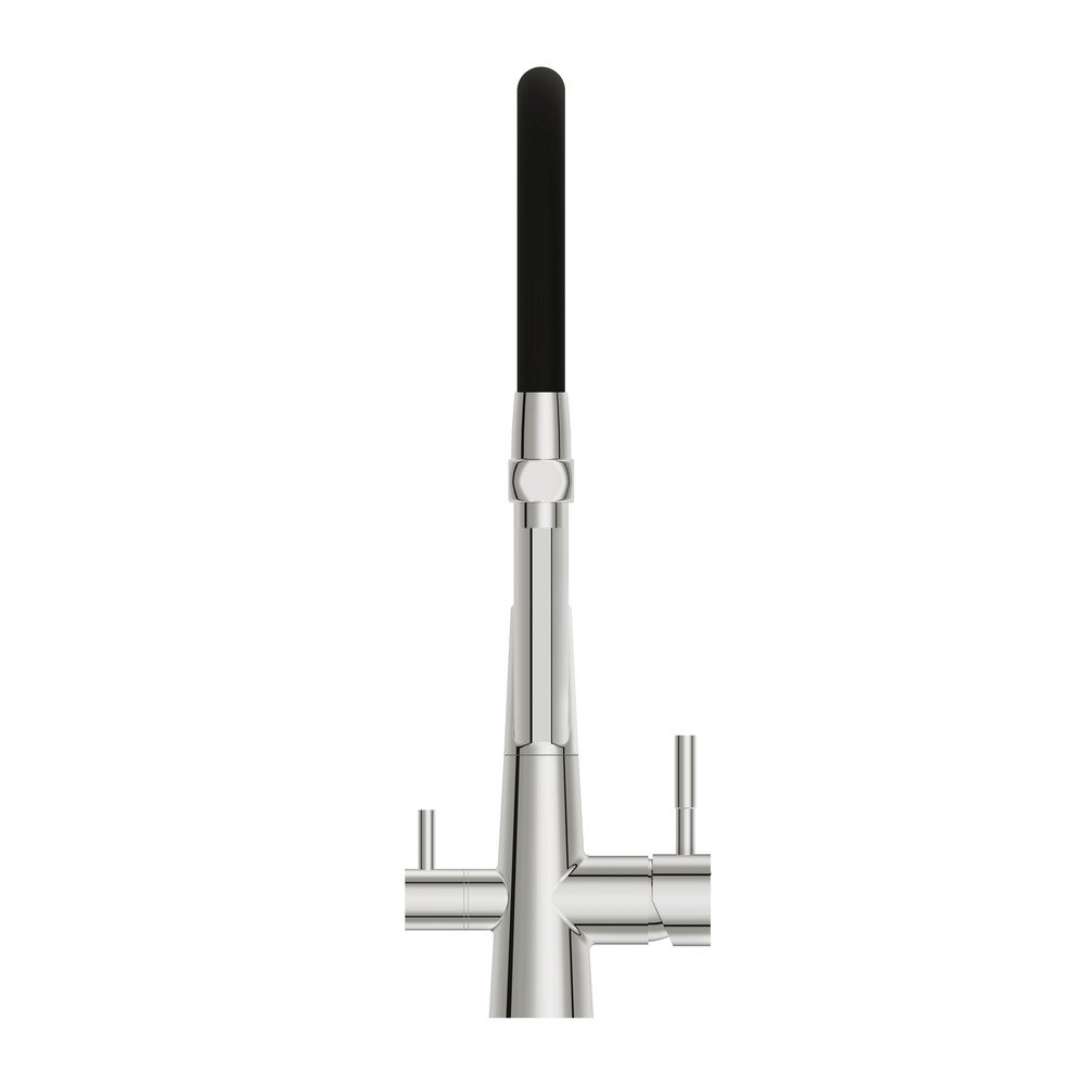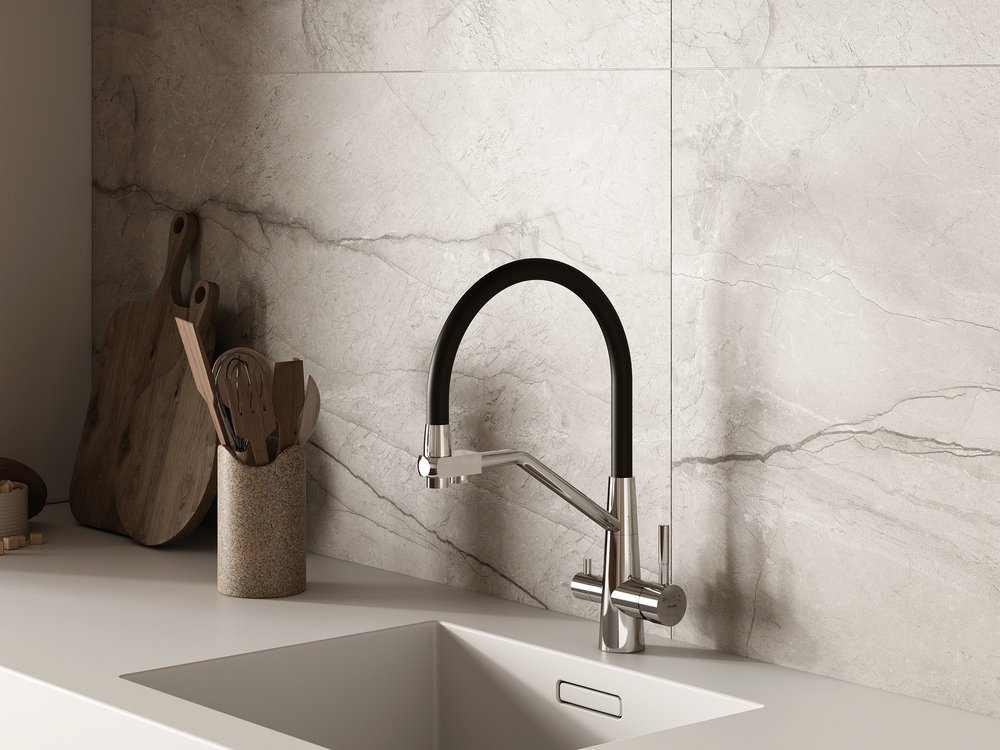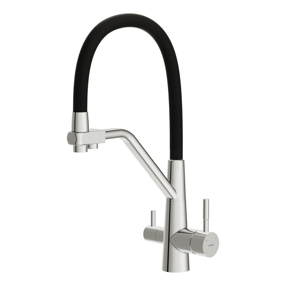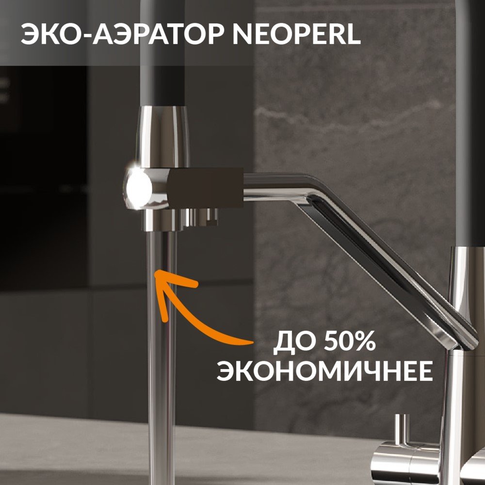 Смесители Vivo стали воплощением лучших технических идей, цель которых — сделать нашу жизнь комфортнее. Модель с необычным дизайном выгодно дополнит любую кухню, от классической до лофтовой или хайтека. Два отдельных излива под проточную и фильтрованную воду решат бытовые задачи. Смеситель оснащен гибким изливом из термостойкого силикона. Материал нетоксичен, а потому безопасен для использования на кухне. Выполненный из качественных материалов, он обладает повышенной износостойкостью и устойчивостью к перегибам. Отдельный излив предусмотрен под фильтрованную воду. Смеситель оснащен системой с двумя ручками. Одна включает проточную воду, а вторая — проточную. Внутри излива расположен аэратор Neoperl.