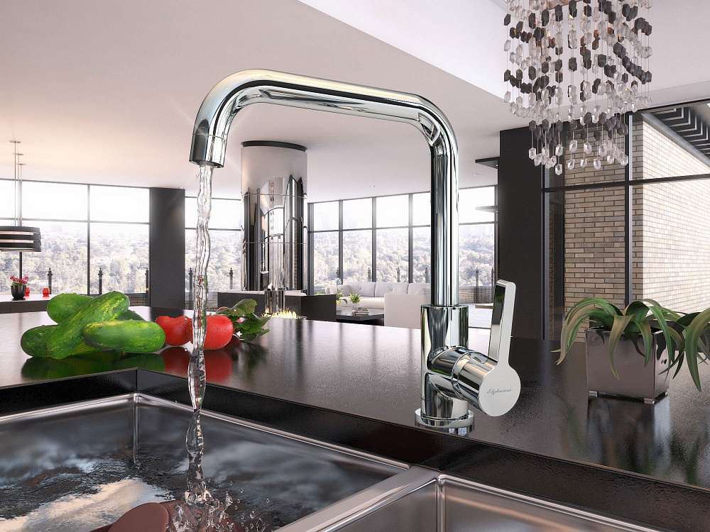 Смеситель Cliq от немецкой компании Elghansa станет стильным дополнением любой современной кухни. Он привлекает внимание своим зеркальным блеском, не тускнеющим со временем. Для его изготовления используется хромированная латунь – экологически безопасный материал, не содержащий вредных веществ. Высокий прямоугольный излив удобен для мытья габаритной посуды и наполнения глубоких емкостей. Подачу и мгновенное перекрытие потока осуществляет долговечный и надежный керамический картридж. Рычаг управления поворачивается в сторону «на себя», что позволяет монтировать изделие у стены.