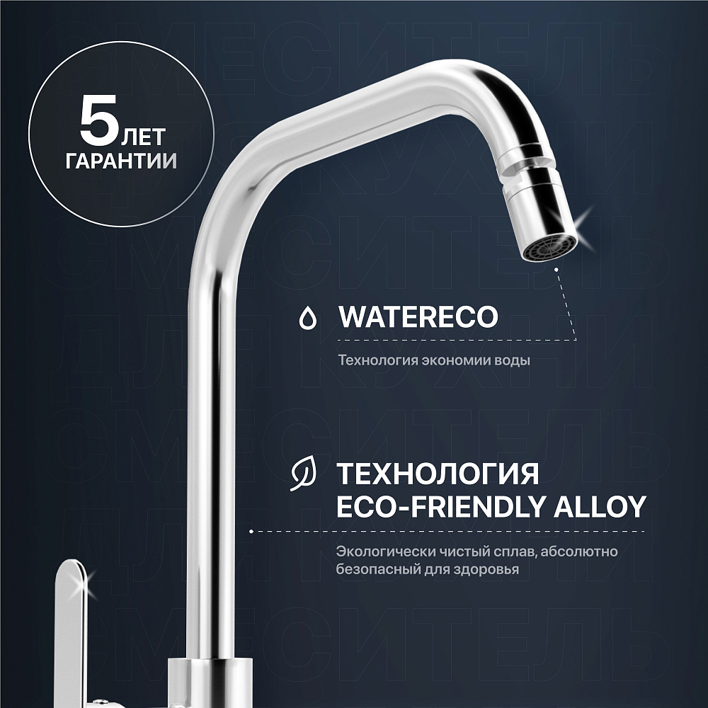 Смеситель для кухни MEGA City MG- ZRV104 выполнен из экологически чистой латуни, стойкой к коррозии (технология Eco-friendly alloy). Сплав не содержит свинца, поэтому абсолютно безопасен для здоровья и минимизирует степень загрязнения воды. Сверху нанесено хромоникелевое покрытие Diamond coating, которое отличается непревзойденной износостойкостью, устойчивостью к царапинам и воздействию чистящих средств.