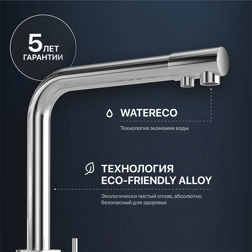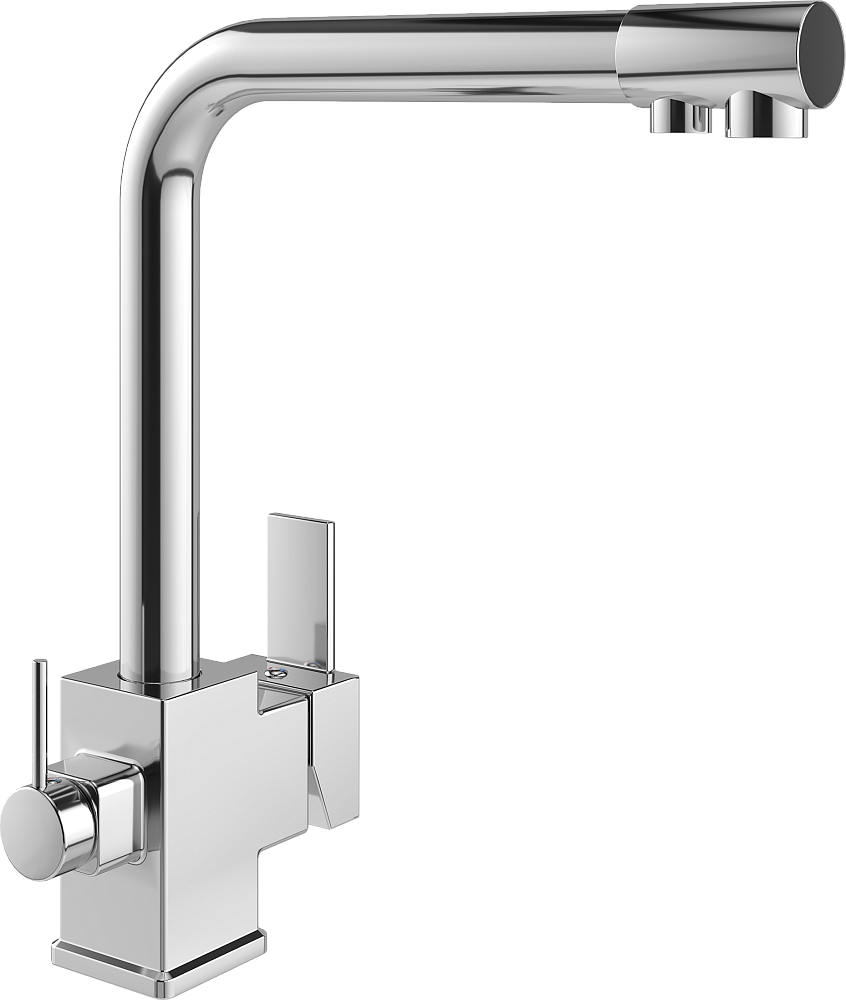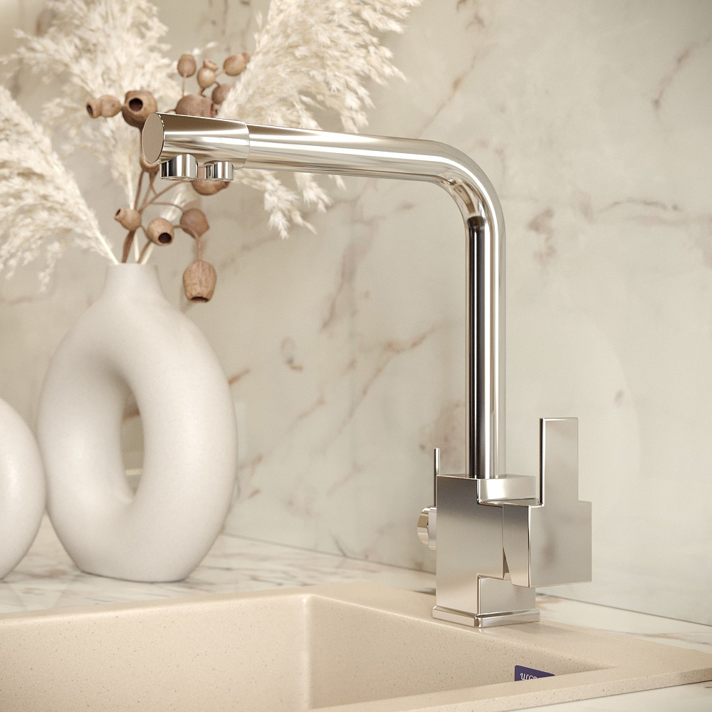 Изюминка модели — встроенный кран фильтра. Для подачи питьевой воды смеситель оснащен дополнительным изливом и отдельным рычагом управления. Это удобно, ведь кран не занимает лишнего места и не требует отдельной установки. Стоит отметить еще три уникальные разработки: WaterECO (экономный расход воды), Diamond coating (хромоникелевое покрытие с непревзойденной износостойкостью, устойчивостью к царапинам и воздействию чистящих средств) и Quick installation (быстрый монтаж с простым креплением). Гарантия на смеситель — 5 лет.