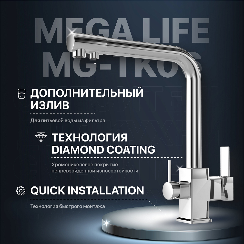 Поворотный смеситель для кухни MEGA Life MG-TK06 с рычажным управлением — сочетание функциональности и стильного европейского дизайна. Надежная, устойчивая к коррозии конструкция выполнена из латуни собственного литейного производства. За счет технологии Eco-friendly alloy сплав не содержит свинца, поэтому является экологически чистым и безопасным для здоровья.