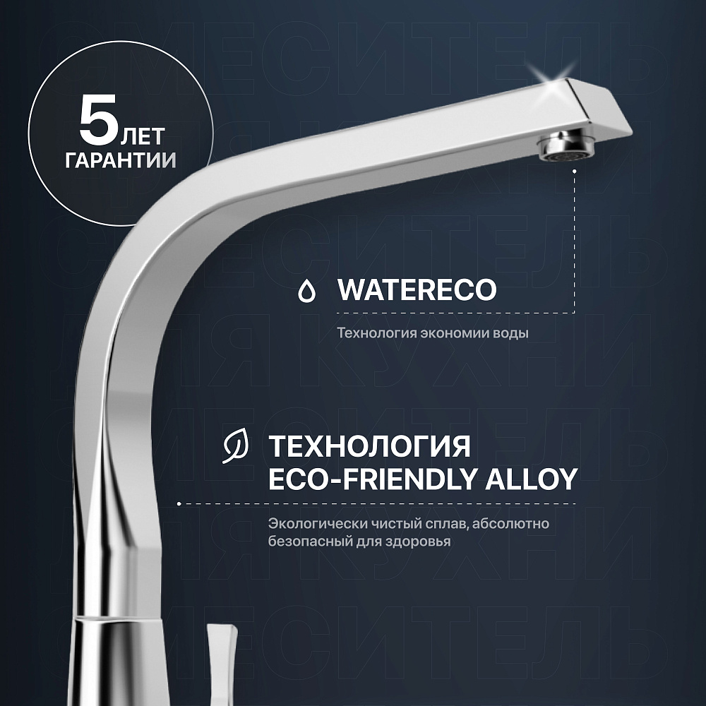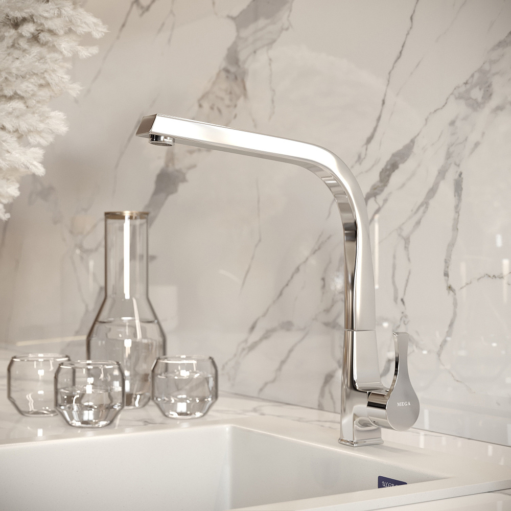 Изысканный дизайн кухонного смесителя MEGA MG-SUN03 никого не оставит равнодушным. Это неудивительно, ведь над разработкой внешнего вида и технологий трудятся специалисты из Германии, Норвегии и Дании. Поверхность глянцевая, с приятным блеском. Его дарит особое хромоникелевое покрытие (технология Diamond coating), которое отличается непревзойденной износостойкостью, устойчивостью к царапинам и воздействию чистящих средств. В поворотный излив встроен аэратор с функцией экономии воды WaterECO, которая поможет снизить траты на водоснабжение и позаботиться о природе.