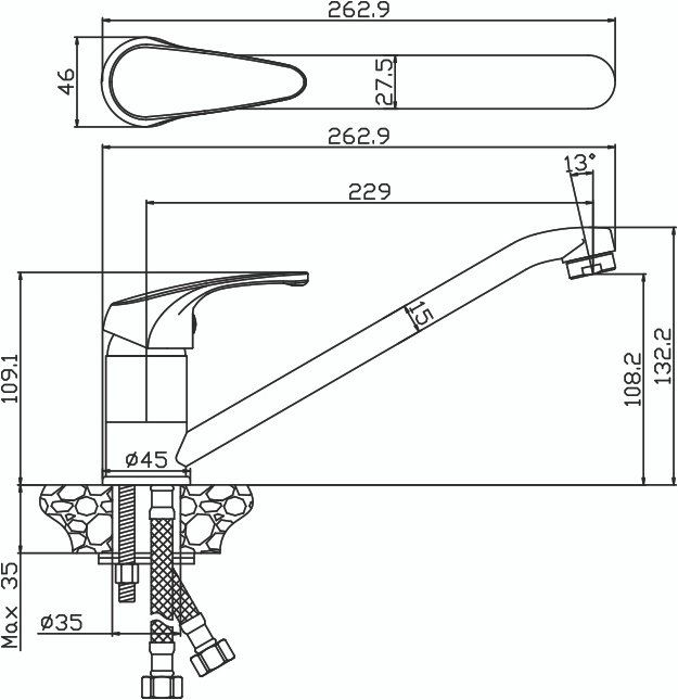 потока. Поворотный излив оснащен пластиковым аэратором Eco, сокращающим расход воды до 9 л/мин
