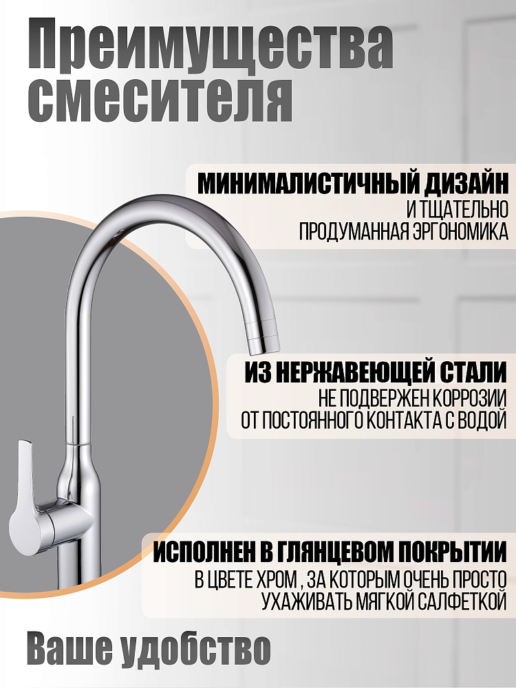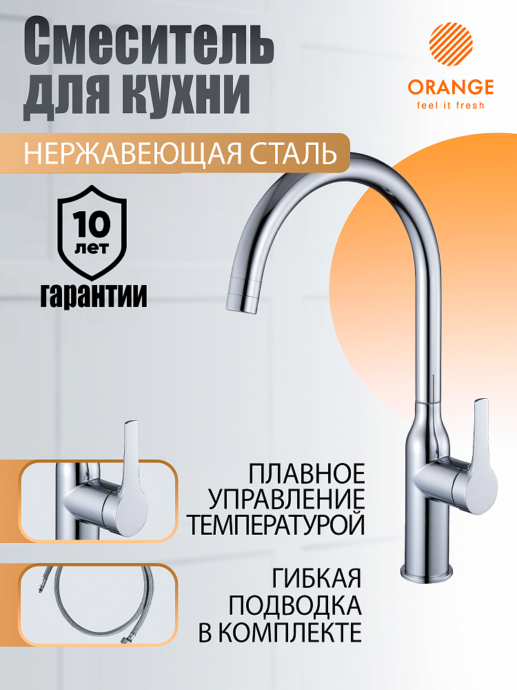 Однозахватный смеситель для кухни с поворотным изливом Orange BONI украсит современный интерьер. Благодаря фирменному картриджу Orange управление напором и температурой воды легкое и плавное. Корпус выполнен из нержавеющей стали, не подверженной коррозии от длительного контакта с водой. Износостойкое покрытие в цвете глянцевый хром обеспечит блеск поверхности на долгие годы. Встроенный аэратор экономит воду и, обогащая струю воздухом, делает её мягкой и без брызг.
