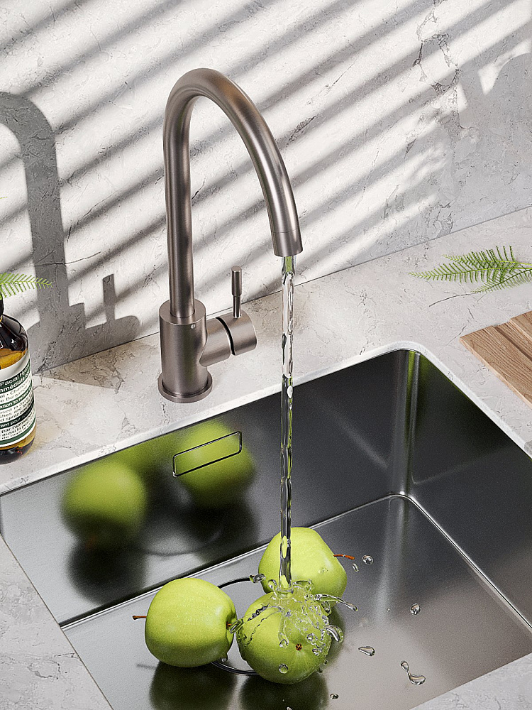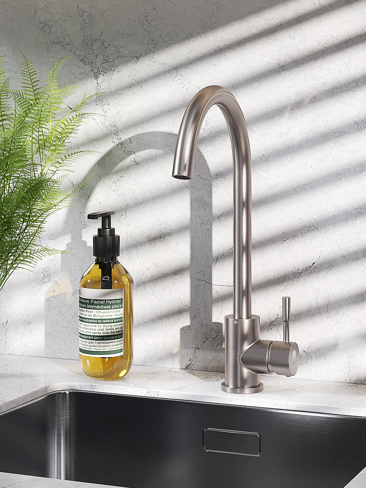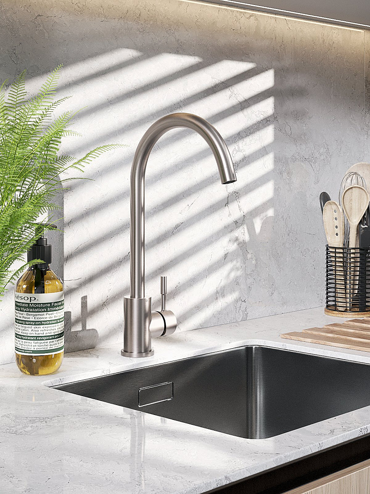 Однозахватный смеситель для кухни с поворотным изливом Orange Steel украсит современный интерьер. Благодаря фирменному картриджу Orange управление напором и температурой воды легкое и плавное. Корпус выполнен из нержавеющей стали, не подверженной коррозии от длительного контакта с водой. Износостойкое покрытие в цвете матовый никель нанесено по технологии вакуумного напыления (PVD), на нем незаметны разводы от высохшей воды и отпечатки пальцев. Встроенный аэратор экономит воду и, обогащая струю воздухом, делает её мягкой и без брызг.