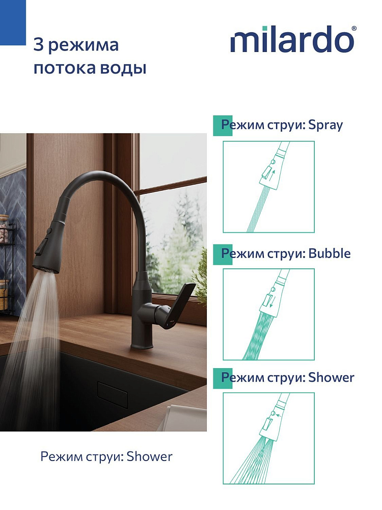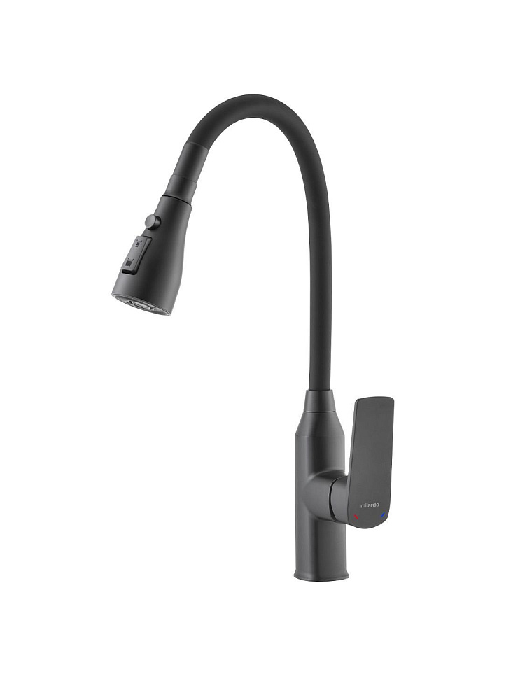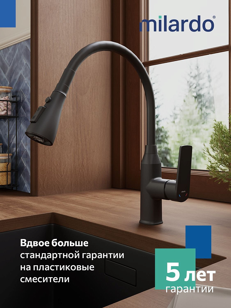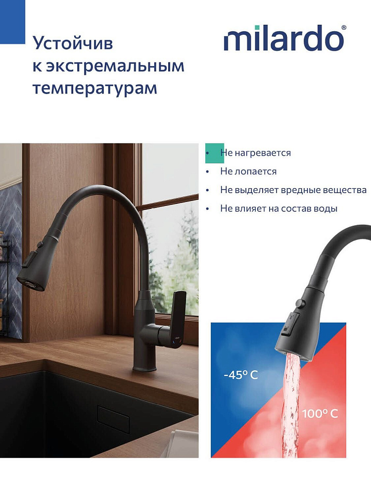 Смеситель для кухни с гибким изливом, черный матовый, Milardo, Poli, POLBL0FM05