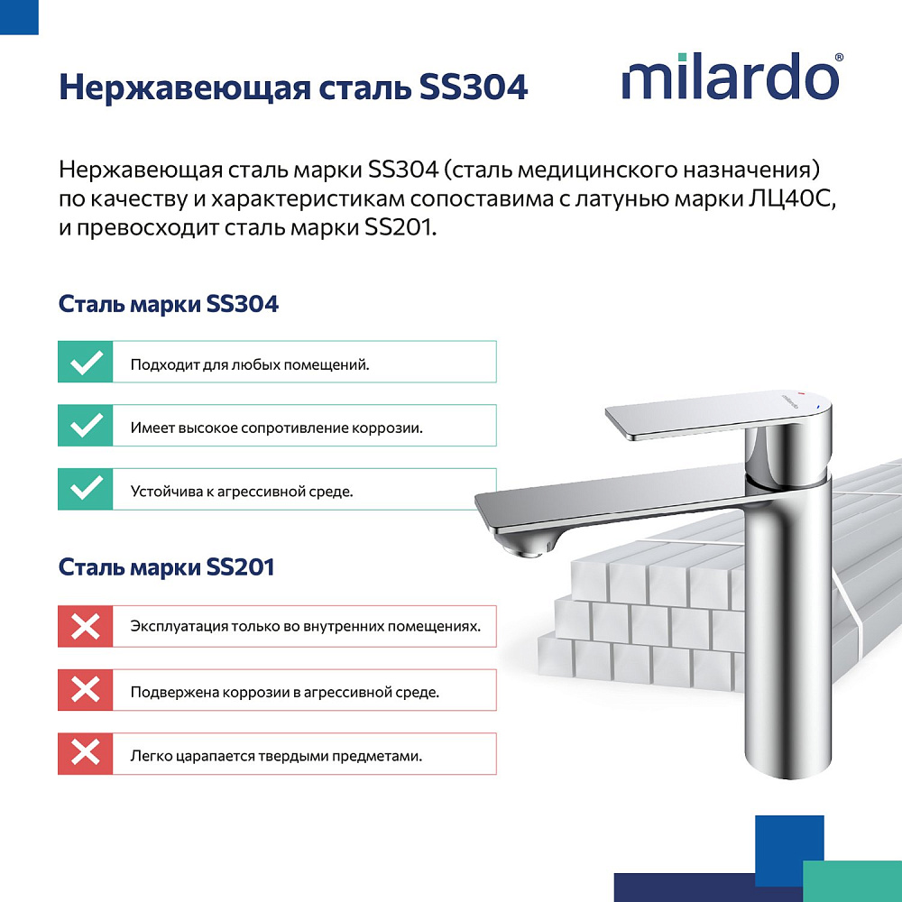 Корпус смесителя Milardo изготовлен из высококачественной нержавеющей стали марки SS304, устойчивой к коррозии и обладающей повышенной прочностью, что обеспечивает долговечность изделия даже при постоянном контакте с водой. Благодаря ударопрочным свойствам материала смеситель сохраняет безупречный внешний вид и функциональность в течение длительного срока эксплуатации.