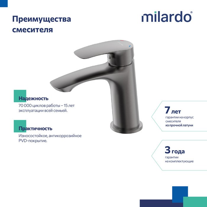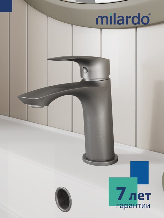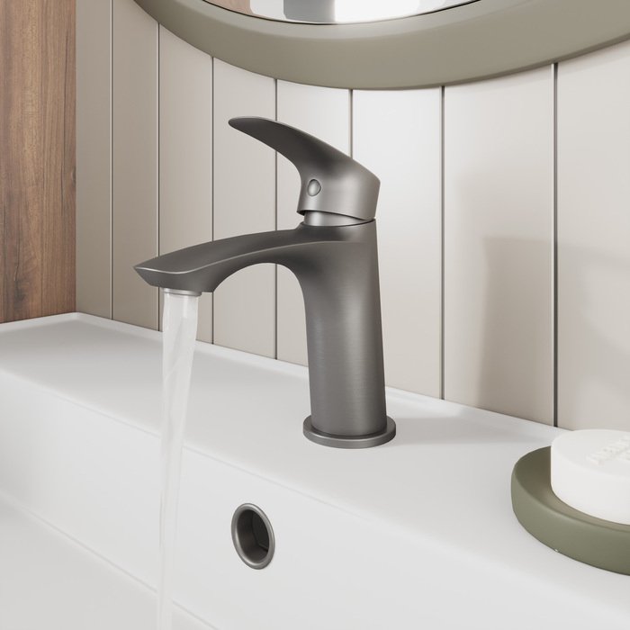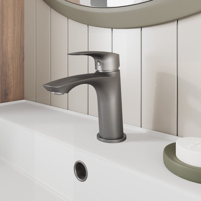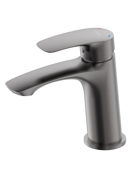 Смеситель для умывальника отличается универсальным характером: основной акцент в его дизайне приходится на плавные линии корпуса и трендовый цвет. Модель в графитовом цвете одинаково выигрышно смотрится на контрастных белоснежных раковинах и дополняет собой керамику темных оттенков. Благодаря увеличенному выносу излива вода из смесителя поступает в раковину в самой удобной точке, что обеспечивает максимальную свободу движения в зоне умывания. В комплекте гибкая подводка и крепеж.