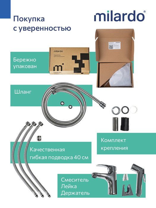 Эргономичная лейка с нажимным механизмом и душевым шлангом длиной 1,5 метра, гибкая подводка и крепеж идут в комплекте.