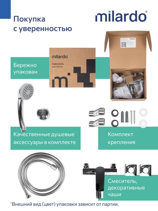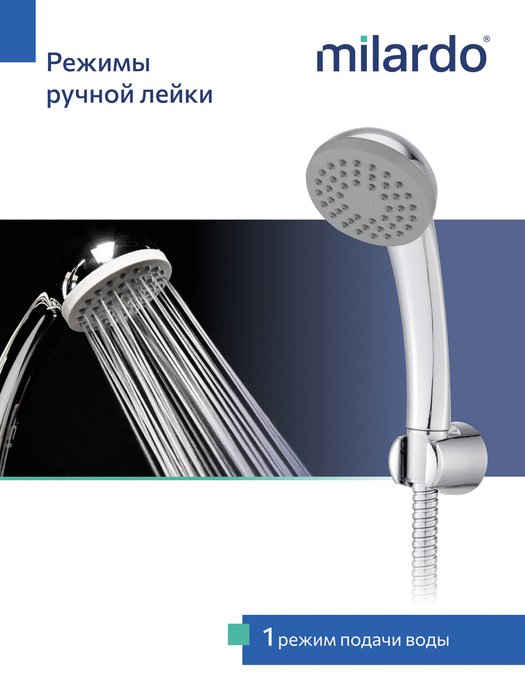 Ручная однорежимная лейка, душевой шланг (1,5 м) в оплетке из нержавеющей стали и крепеж идут в комплекте.