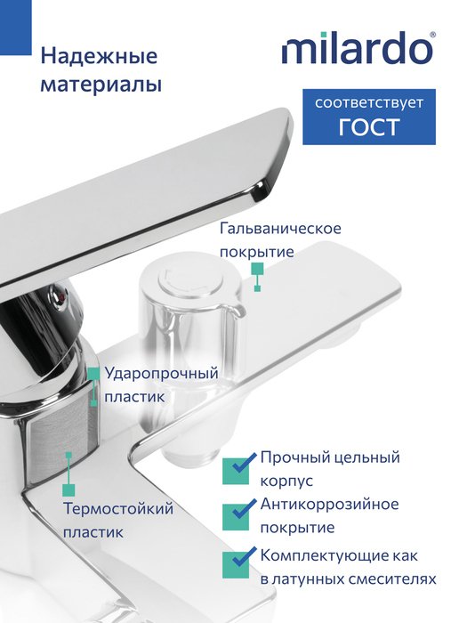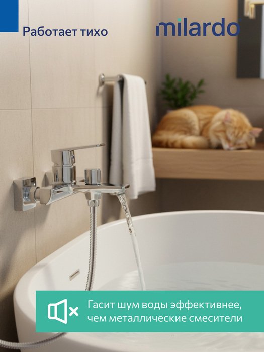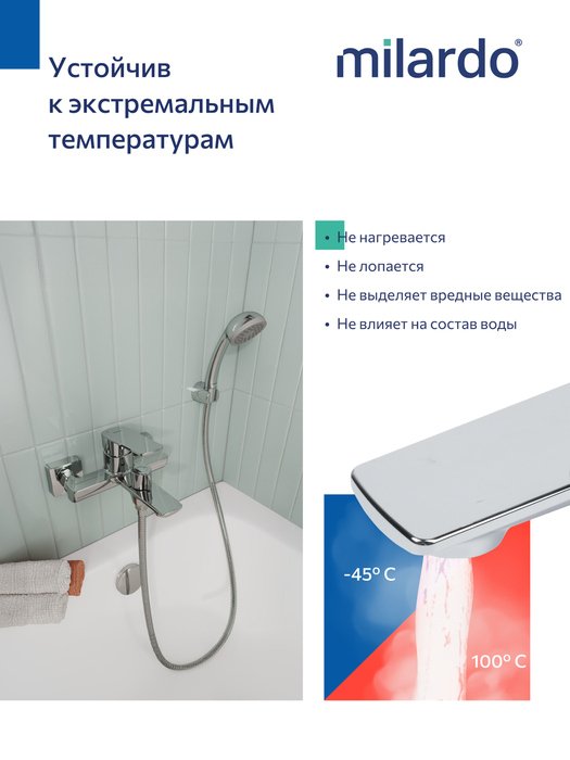 Цельный корпус смесителя для ванны выполнен из современного полимерного сплава, используемого для магистральных трубопроводов. Такой материал не содержит и не выделяет в воду вредные примеси; не разрушается под воздействием влаги, солей и хлора. Пластик обладает высокой термоустойчивостью, не нагревается и не обжигает при эксплуатации.