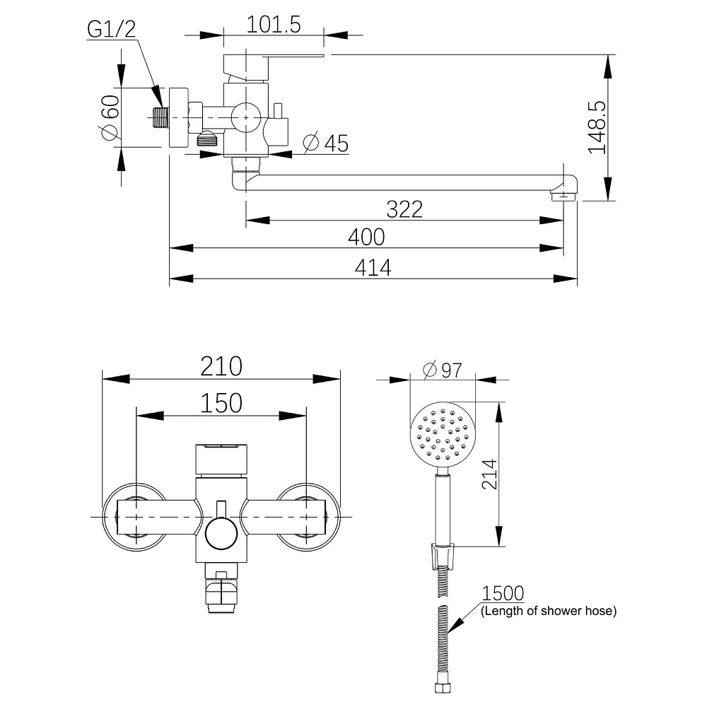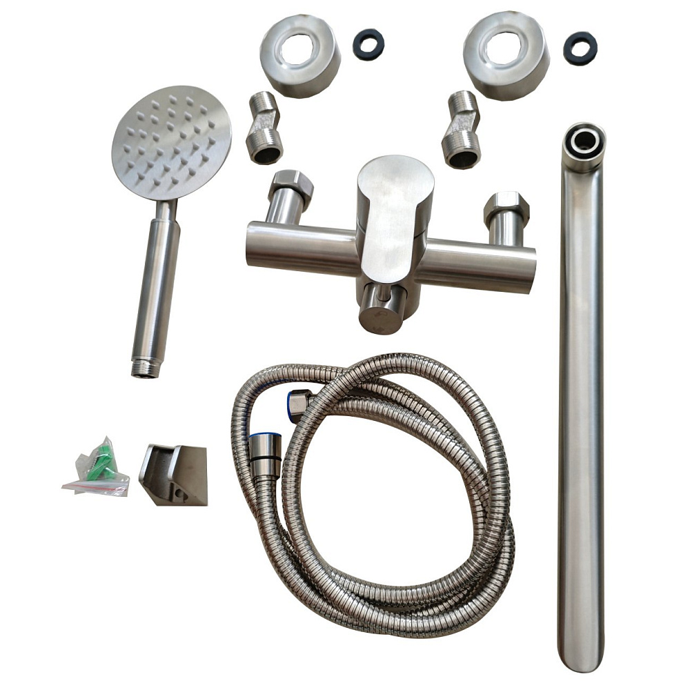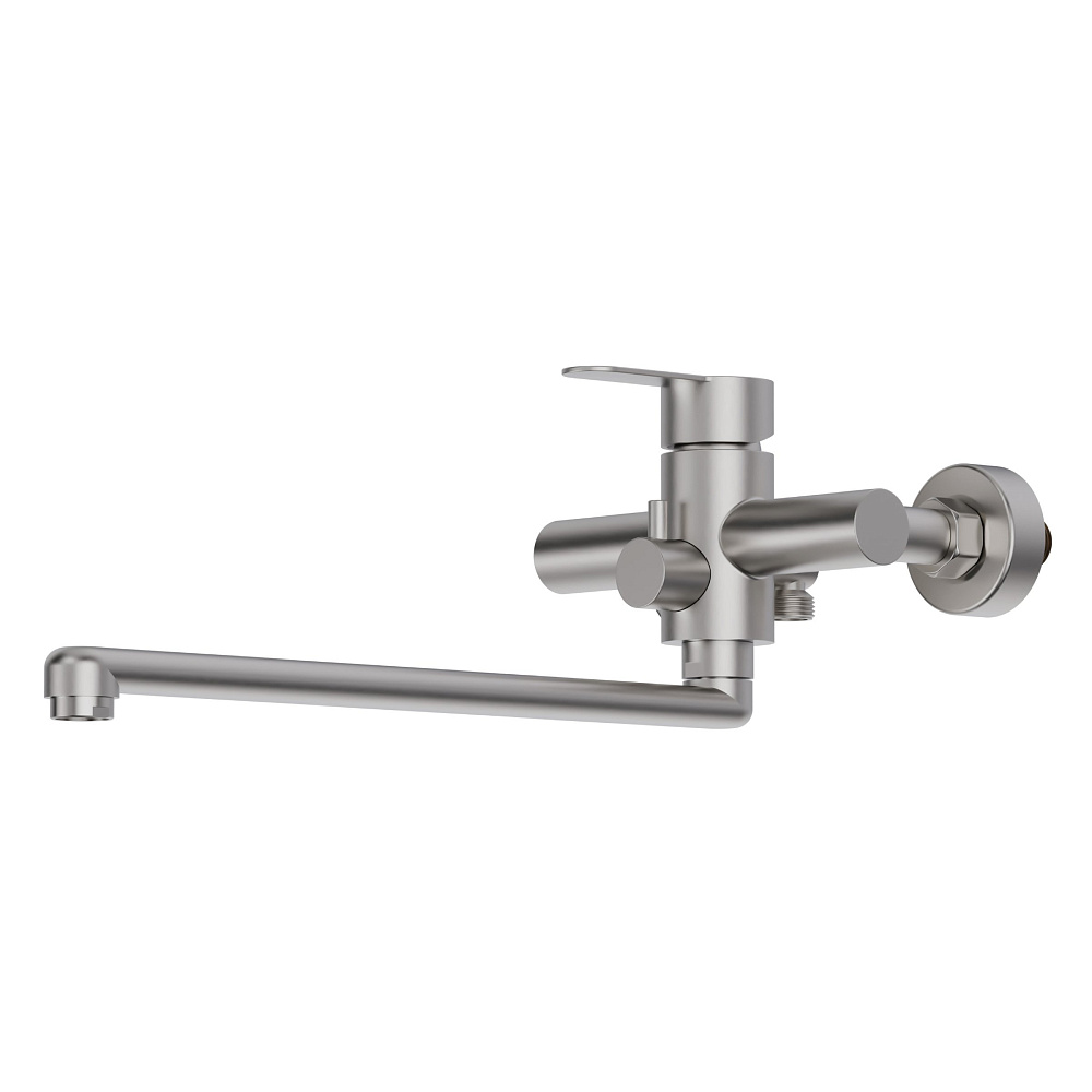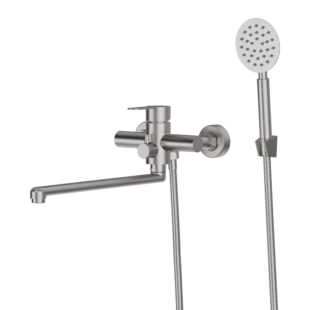Однозахватный смеситель для ванны/душа с универсальным изливом и душевым набором Agger Zest гармонично дополнит и украсит интерьер Вашей ванной комнаты. Корпус выполнен из нержавеющей стали, не подверженной коррозии от длительного контакта с водой. Фирменный картридж Agger делает легким управление напором и температурой воды, а керамический поворотный дивертор переключит ее направление с излива на душ даже при низком давлении. Износостойкое покрытие в цвете матовый никель нанесено по технологии вакуумного напыления (PVD), на нем незаметны разводы от высохшей воды и отпечатки пальцев. Аэратор экономит воду и, обогащая струю воздухом, делает её мягкой и без брызг. В комплекте душевой набор: ручная лейка d97 мм (1 режим), душевой шланг 1500 мм в металлической оплетке (с защитой от перекручивания) и настенный держатель лейки.