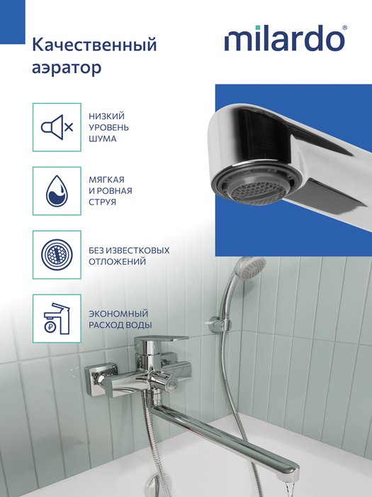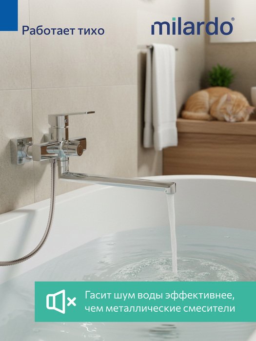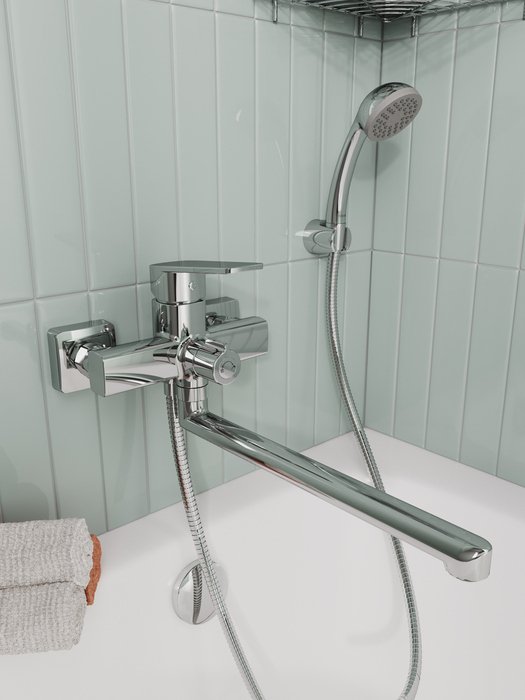 Смеситель создан под проекты современных интерьеров: умеренно геометричные линии модели подойдут к сантехнике и мебели, как квадратных, так и скругленных форм. С длинным (29 см) изливом использовать пространство ванной получается намного эффективней, а поворотный излив позволяет охватить большую ее площадь.