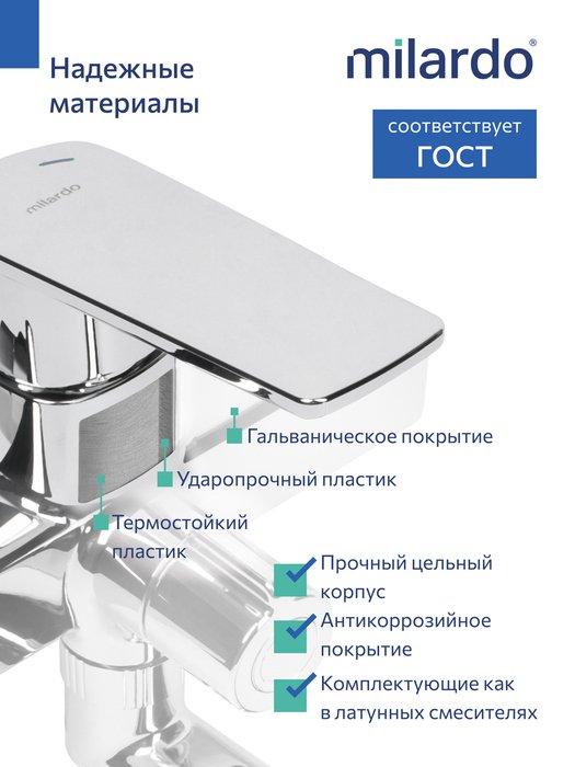 Цельный корпус смесителя для ванны выполнен из современного полимерного сплава, используемого для магистральных трубопроводов. Такой материал не содержит и не выделяет в воду вредные примеси; не разрушается