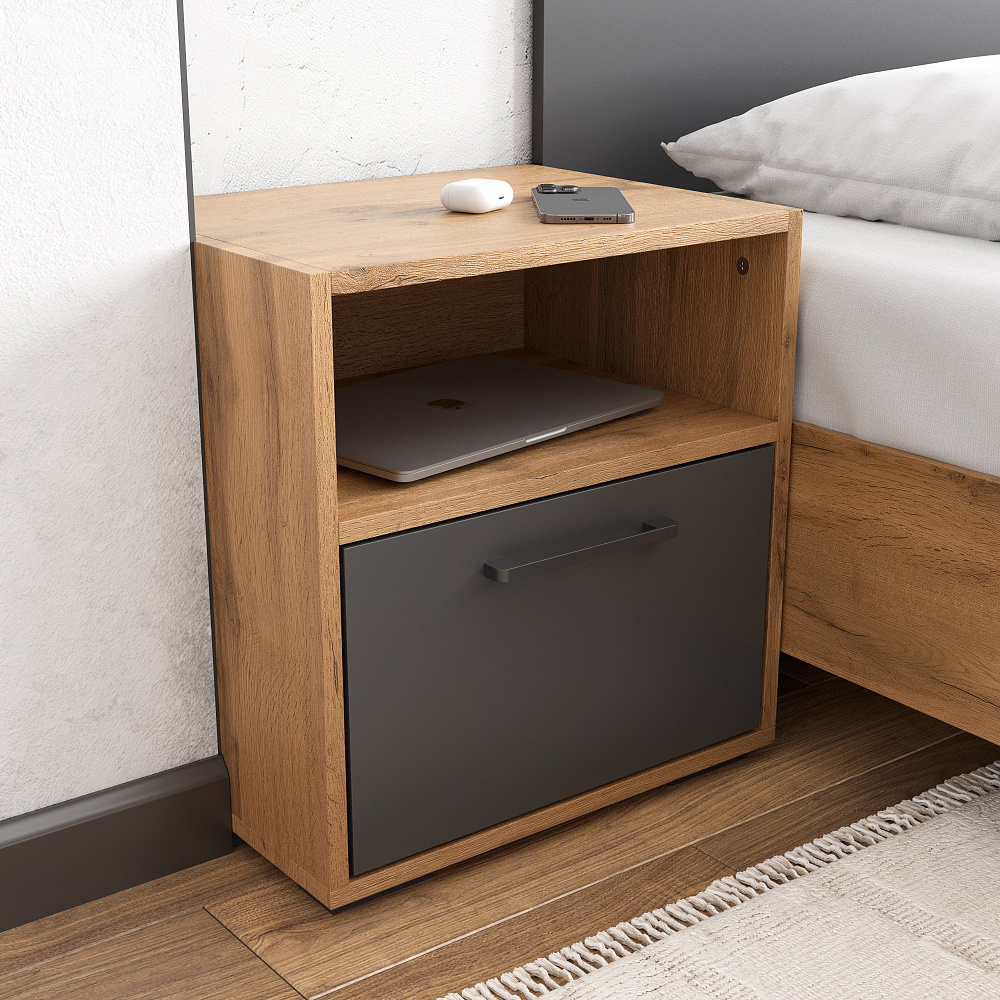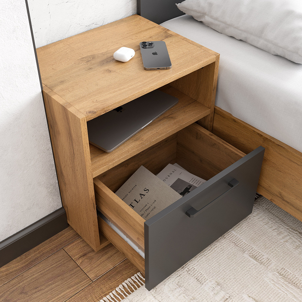 Спальный гарнитур DIWO Кострома 2 160x200 с тумбами, матрасом анатомическим, беспружинным, дуб вотан, антрацит, ручка черная
