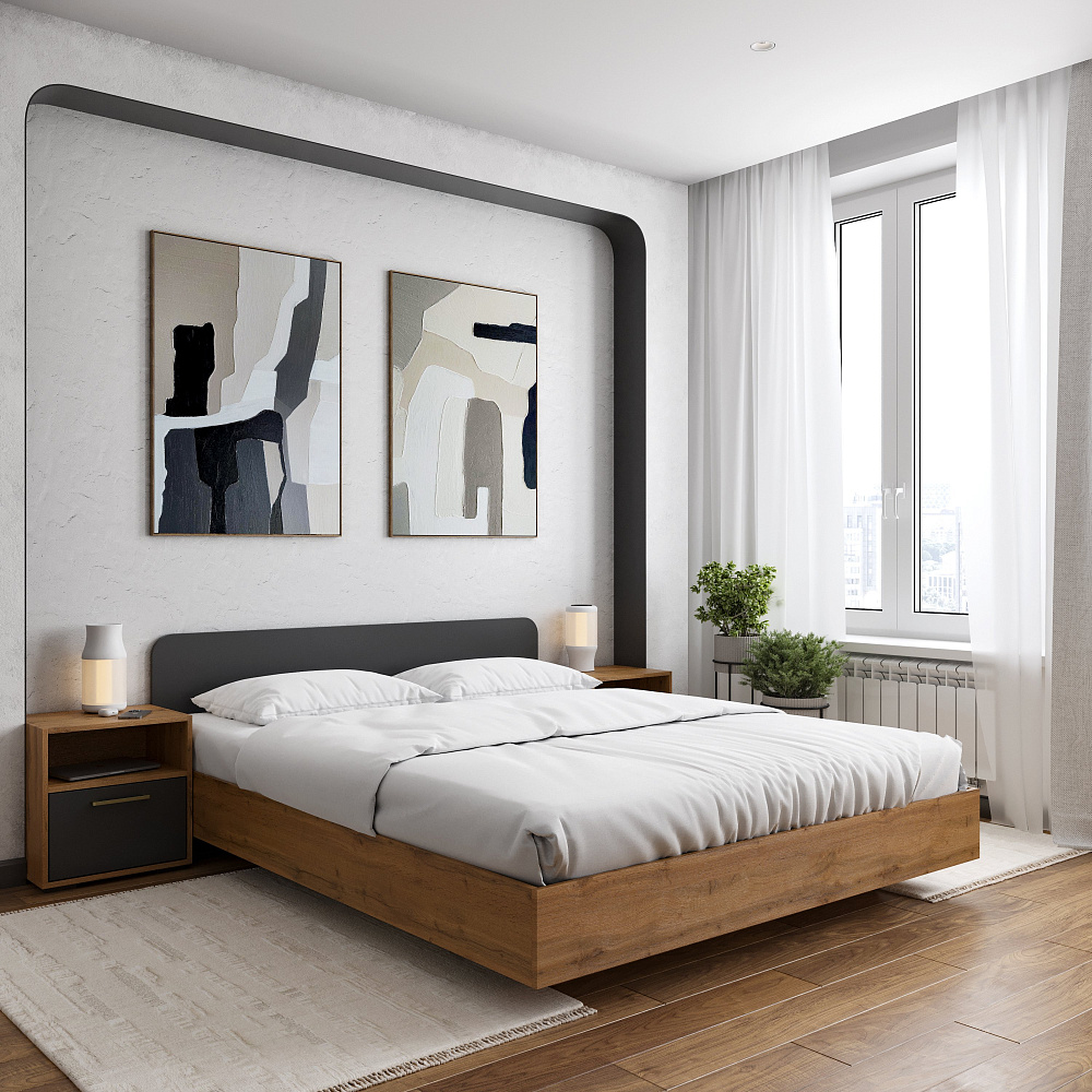 Спальный гарнитур DIWO Кострома 2 160x200 с тумбами, матрасом анатомическим, беспружинным, дуб вотан, антрацит, ручка золото