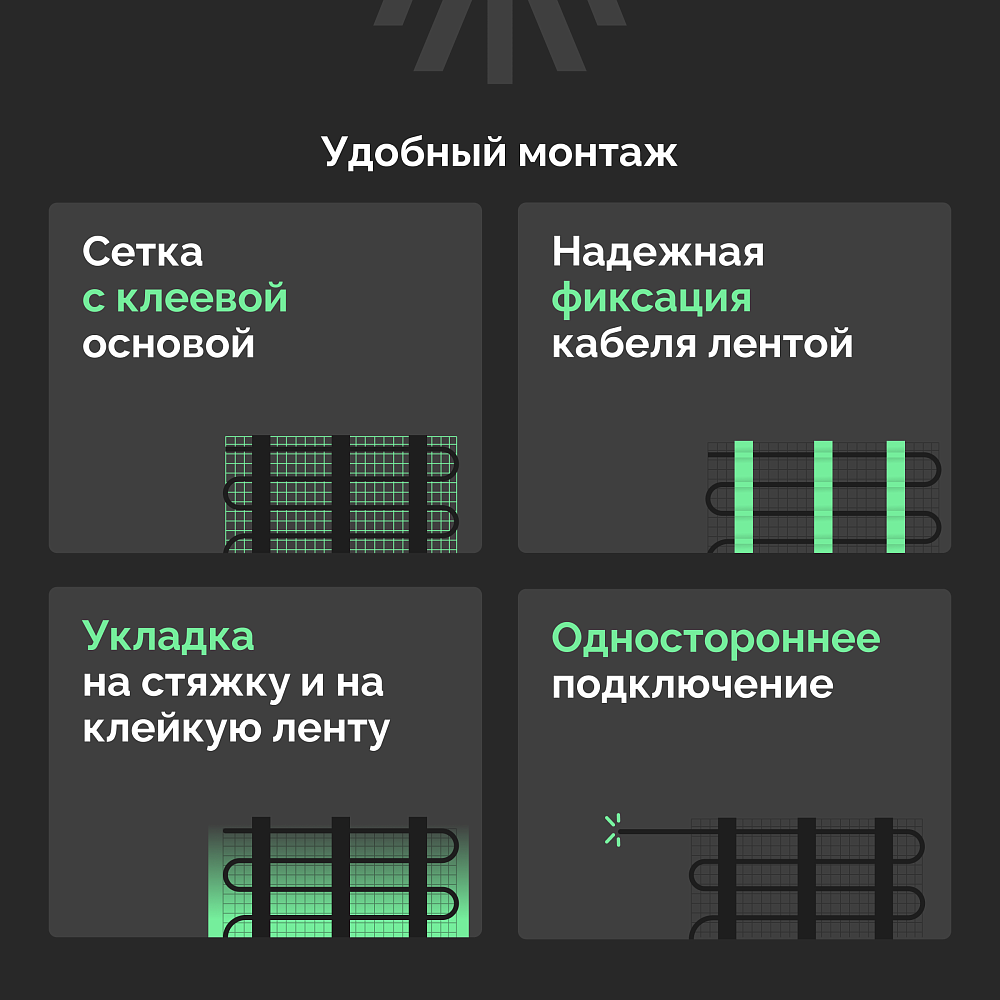 ·         Сетка, на которую закреплен греющий кабель, оснащена клеевой основой, поэтому монтаж простой и не занимает много времени даже при больших объемах укладки.