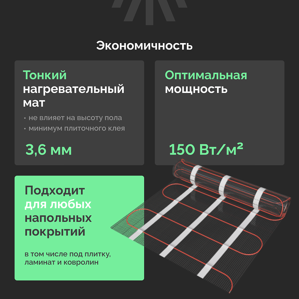 ·         Очень тонкий мат, всего 3,6 мм, что совершенно не влияет на высоту пола и позволяет уложить теплый пол в помещениях практически с любыми параметрами.