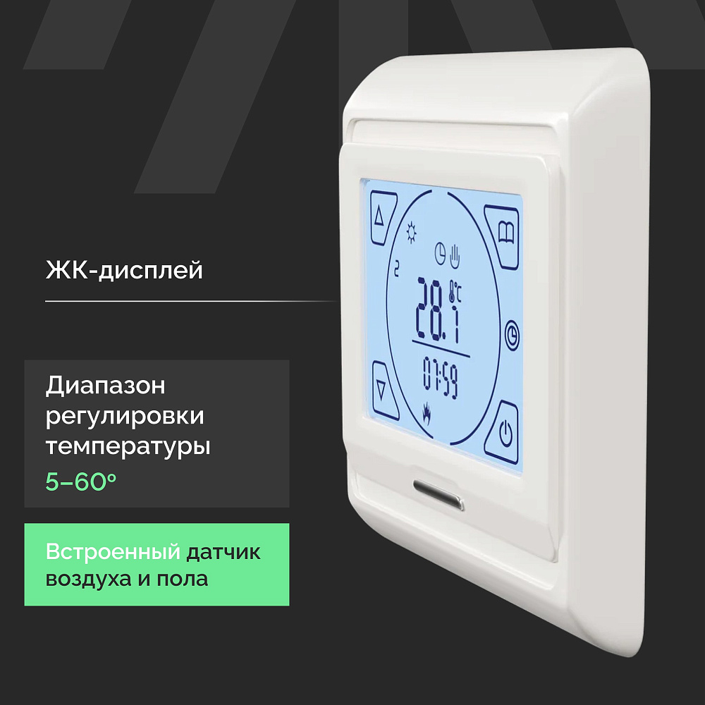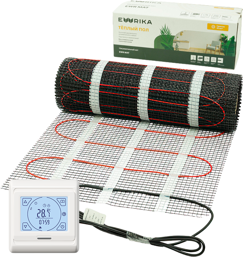 Комплект тёплого пола EWRIKA MAT EWR 150-5 с терморегулятором ТЕП91Б — это идеальное решение для создания комфортного микроклимата в вашем доме. Он обладает рядом преимуществ, которые делают его незаменимым помощником в создании уютной атмосферы. Одним из главных преимуществ этого комплекта является его тонкость. Мат имеет толщину всего 3,6 мм, что позволяет сохранить высоту пола и не требует значительных изменений в конструкции. Вы можете установить тёплый пол практически в любом помещении, не беспокоясь о том, что он займёт слишком много места. Ещё одним важным аспектом является пожаробезопасность. Кабель, используемый в этом комплекте, экранированный и имеет самозатухающую оплётку. Это означает, что материалы не смогут загореться даже при возникновении пожара. Таким образом, вы можете быть уверены в безопасности своего дома. Монтаж этого комплекта также не вызовет у вас затруднений. Сетка, на которую закреплён греющий кабель, оснащена клеевой основой. Это позволяет быстро и легко установить мат на поверхность, даже если вам нужно покрыть большую площадь. Оболочка из ПВХ повышенной прочности защищает нагревательный мат от воздействия влаги. Вы можете установить его в помещениях с повышенной влажностью или перепадами температур, таких как санузлы, ванные, кухни, балконы и другие. Кабель, используемый в комплекте, является двужильным экранированным, что делает его экологичным и пожаробезопасным. Оболочка мата обладает повышенной прочностью и защищает от воздействия влаги, поэтому его можно монтировать в стяжку, в плиточный клей под плитку или под кафель. Наконец, подключение комплекта осуществляется через любой универсальный терморегулятор для тёплого пола. Это позволяет вам легко контролировать температуру и создавать оптимальный микроклимат в вашем доме. Не упустите возможность приобрести комплект тёплого пола EWRIKA MAT EWR 150-5 с терморегулятором ТЕП91Б и наслаждаться комфортом и уютом в своём доме круглый год!