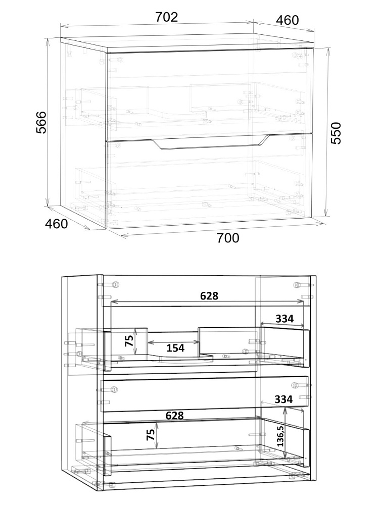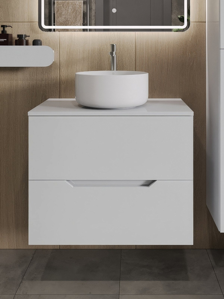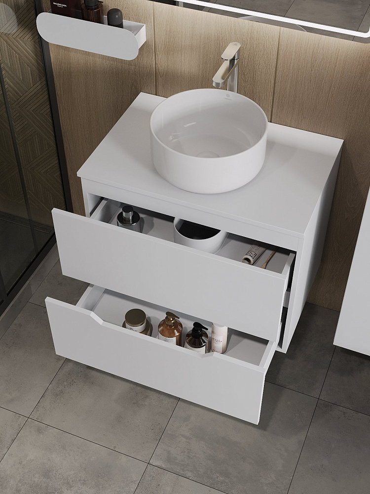 Мебель покрыта пленкой ПВХ с технологией Soft Touch — ламинация класса премиум, с повышенными тактильными свойствами. Пленка обеспечивает дополнительную защиту мебели от влаги и перепадов температуры. На ящики установлены комплекты скрытых направляющих Hettich, обеспечивающие полное выдвижение и имеющие встроенную систему плавного и бесшумного закрывания. Отверстия в столешнице под раковину и смеситель монтируются самостоятельно.