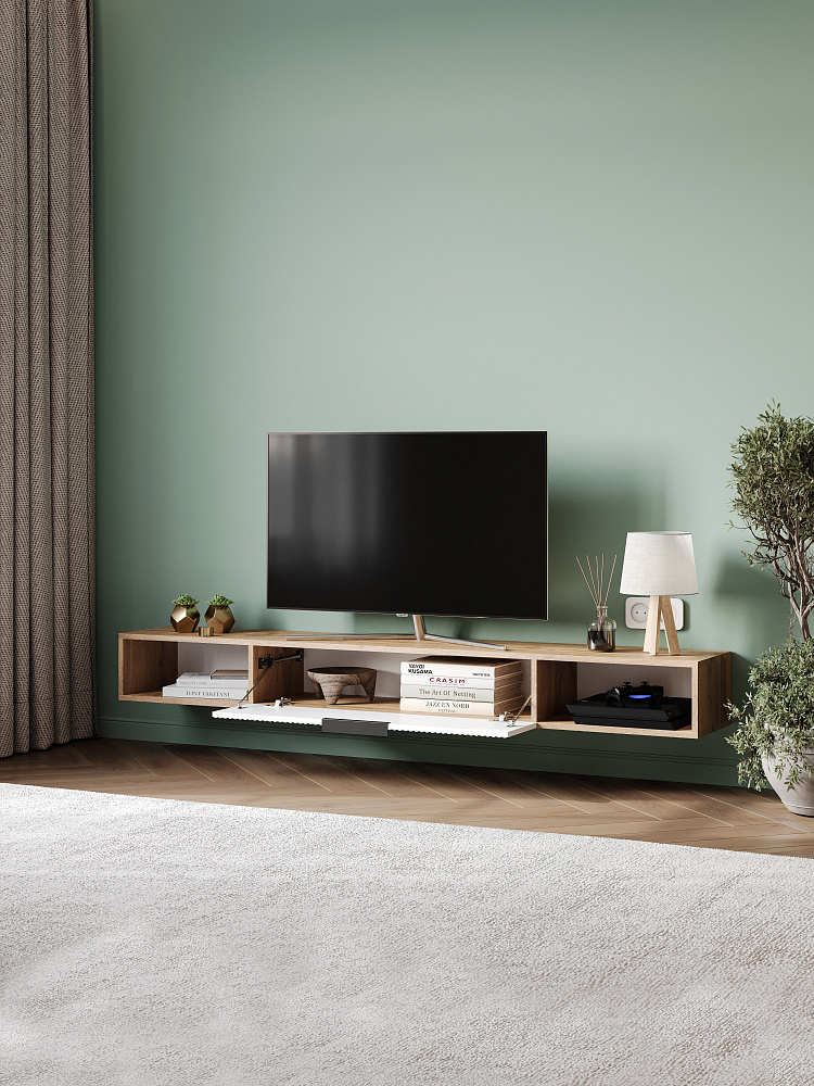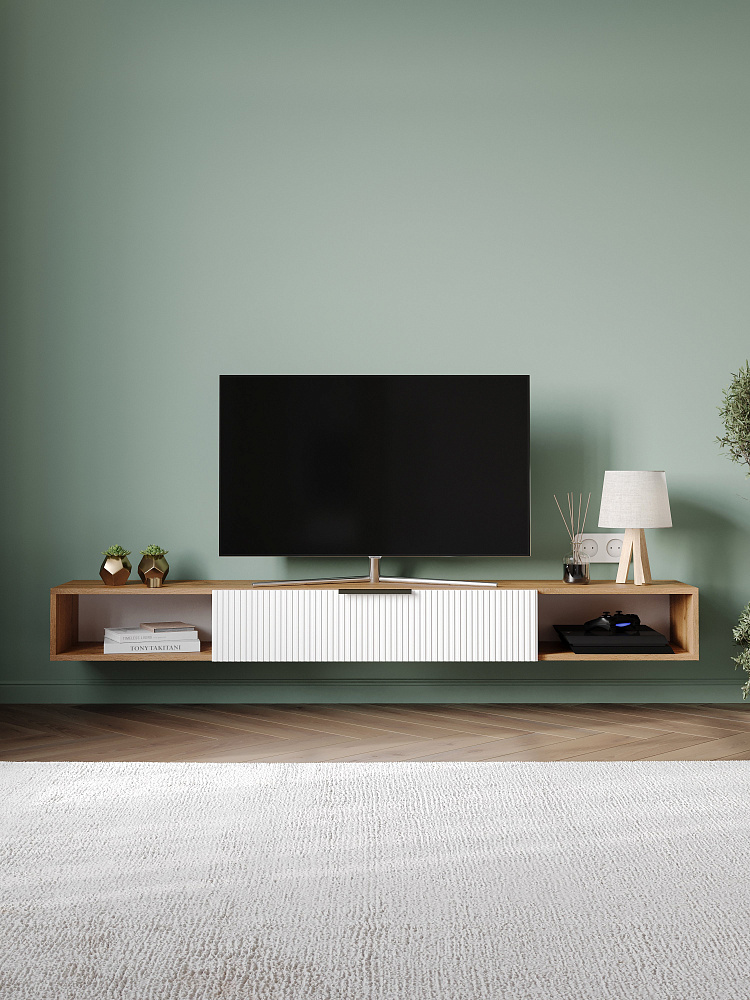 Тумба под телевизор DIWO Краснодар подвесная 180x20x30, см белая, дуб вотан, ручка черная