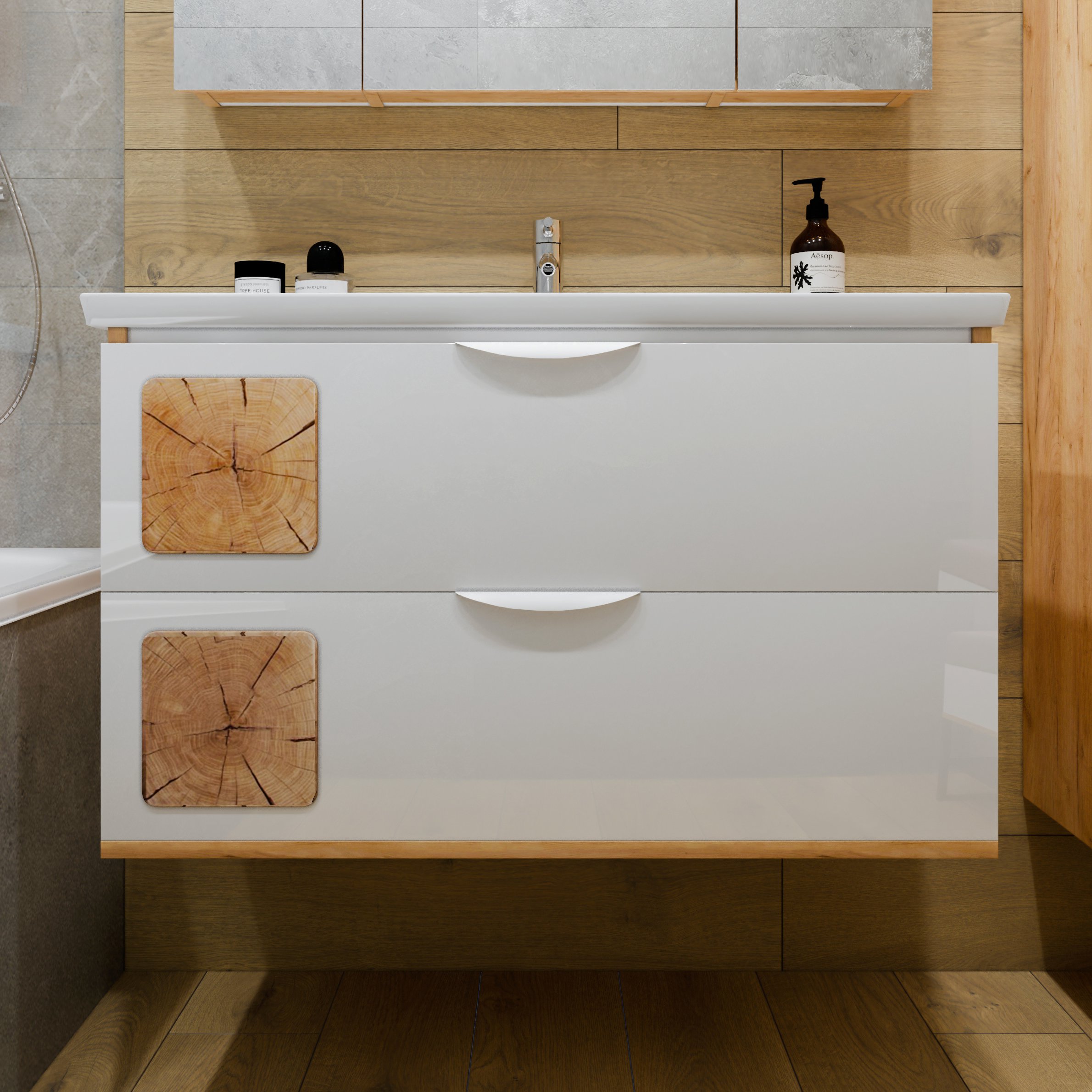 Тумба с раковиной «Бриклаер Форест 100» в цвете «дуб золотой, белый глянец» с раковиной «Фостер 100» — это идеальное решение для вашей ванной комнаты. Она сочетает в себе стильный дизайн, высокое качество и функциональность. Корпус тумбы выполнен из ЛДСП толщиной 16 мм, что обеспечивает прочность и долговечность конструкции. Фасад тумбы также изготовлен из ЛДСП, покрыт лаком и украшен вставками из ЛДСП с рисунком «пенёк». Это придаёт тумбе уникальный и привлекательный вид. Отсутствие задней стенки позволяет легко подвести трубы, что упрощает процесс монтажа и экономит пространство. Тумба с раковиной «Бриклаер Форест 100» станет отличным дополнением к вашему интерьеру и обеспечит комфорт и удобство в использовании.