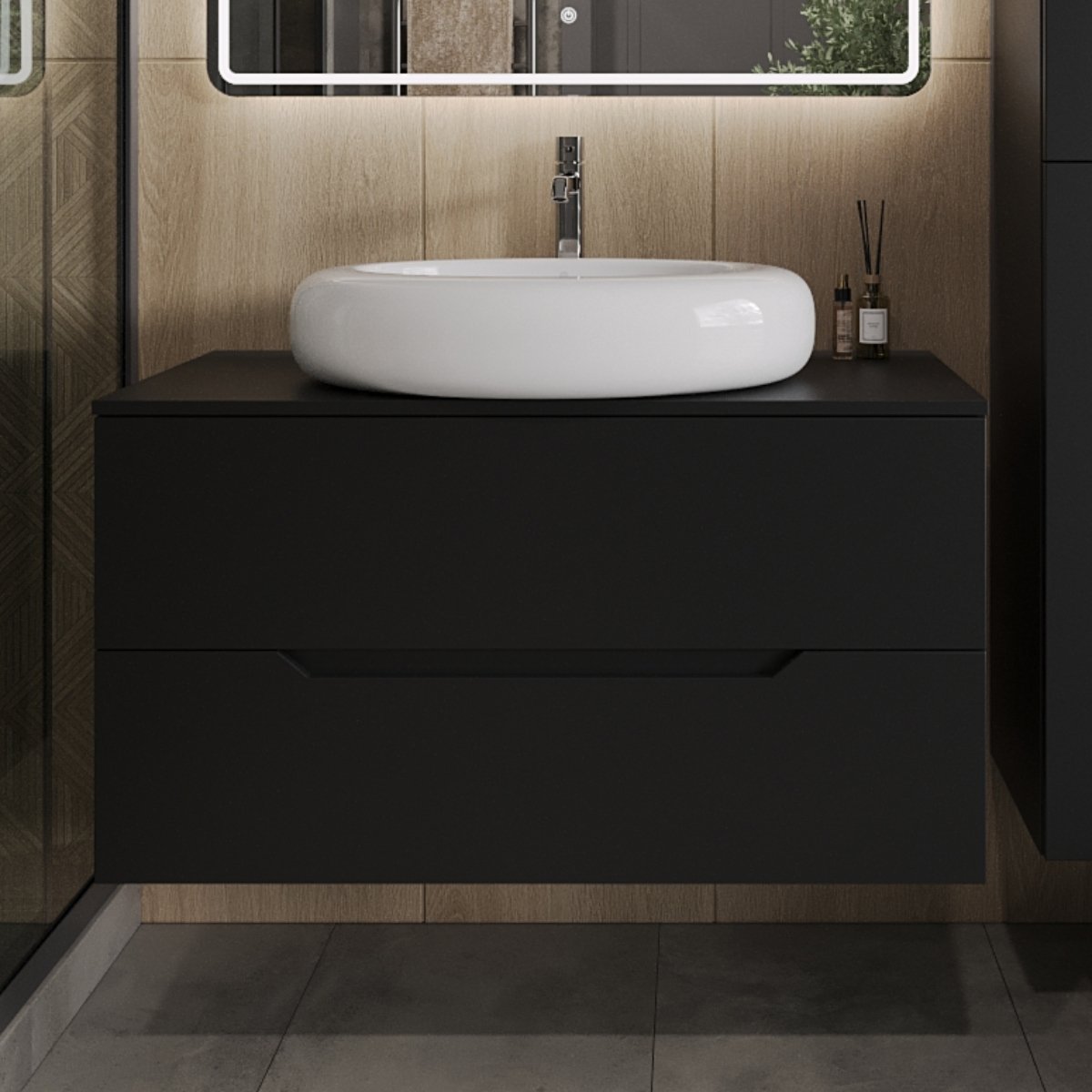 Тумба с раковиной Orange Line 100 подвесная, 2 ящика, матовая черная с раковиной B08-640w