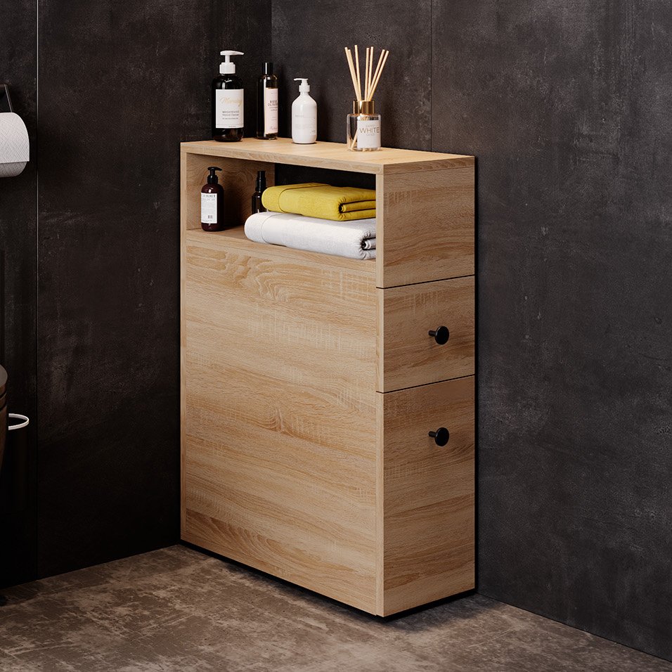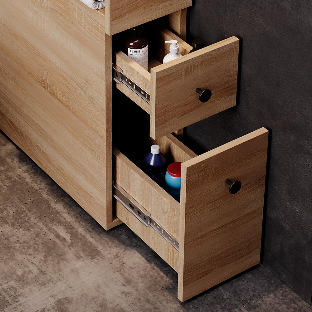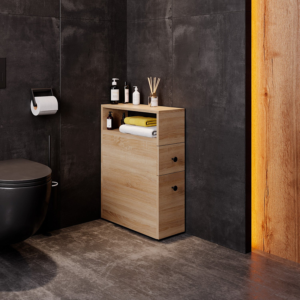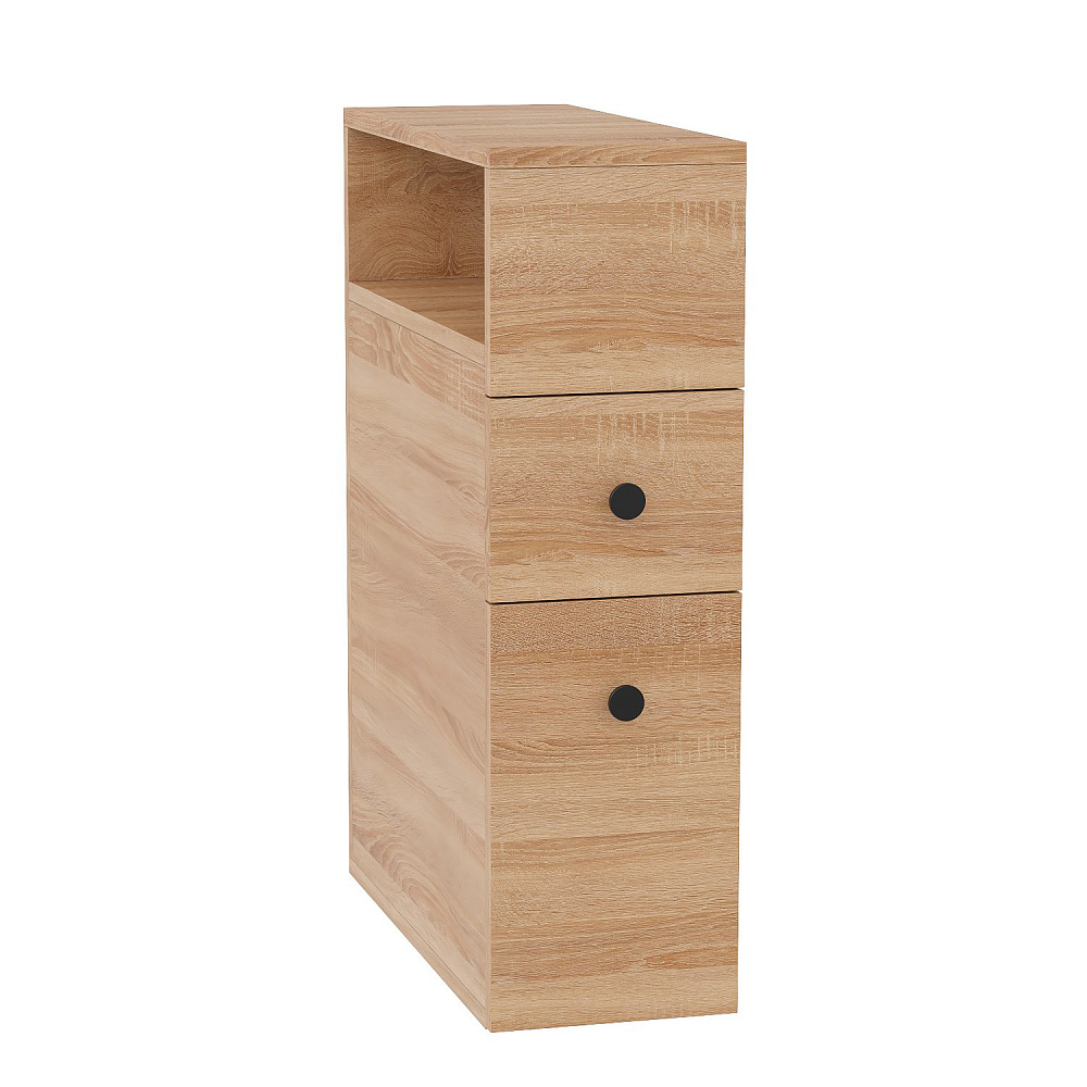 Узкий полупенал Onika Кроун 20 - отличная альтернатива привычным открытым полкам: он позволяет максимально скрыть весь визуальный шум от разноцветных упаковок средств, применяемых в быту. Пенал подходит для размещения в даже в очень компактном пространстве, теплый цвет светлого дуба удачно впишется в любой интерьер. Полупенал прослужит органайзером для хранения средств личной гигиены, туалетной бумаги, для чистящих и моющих средств, для ароматизаторов и для освежителя воздуха, а также прочих аксессуаров, которые удобно держать рядом под рукой. Два выдвижных ящика выдерживают вес до 20 кг. Полупенал выполнен из ЛДСП, устойчивой к механическим воздействиям, перепадам температур и высокой влажности.