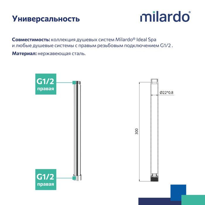 Удлинитель штанги для душевой системы, круглый, глянцевый хром, Milardo, Ideal Spa, ILS30CRM38