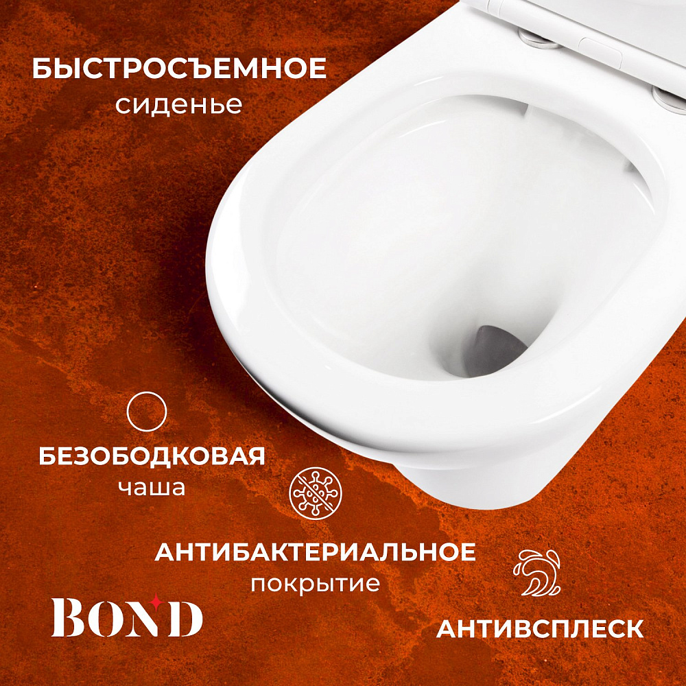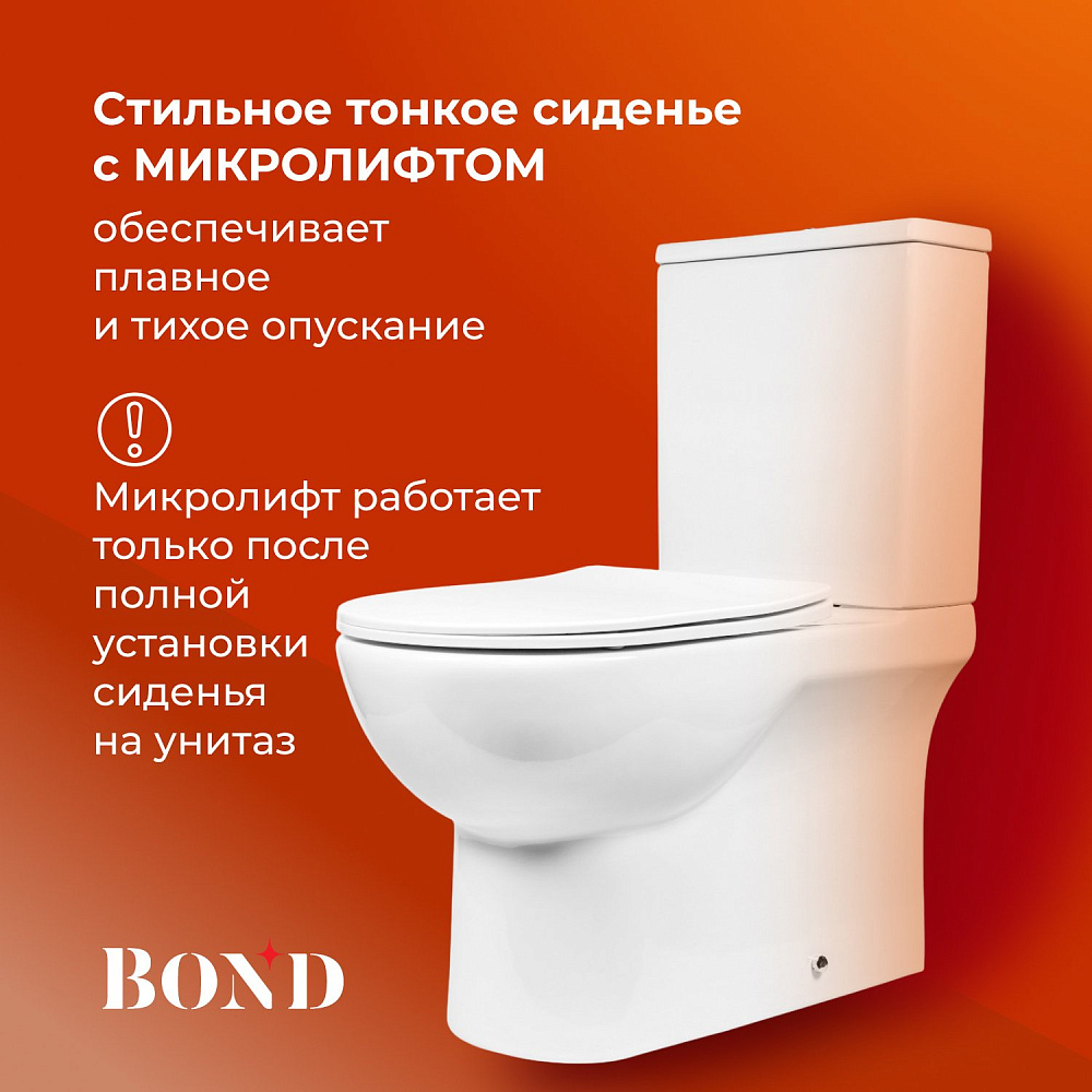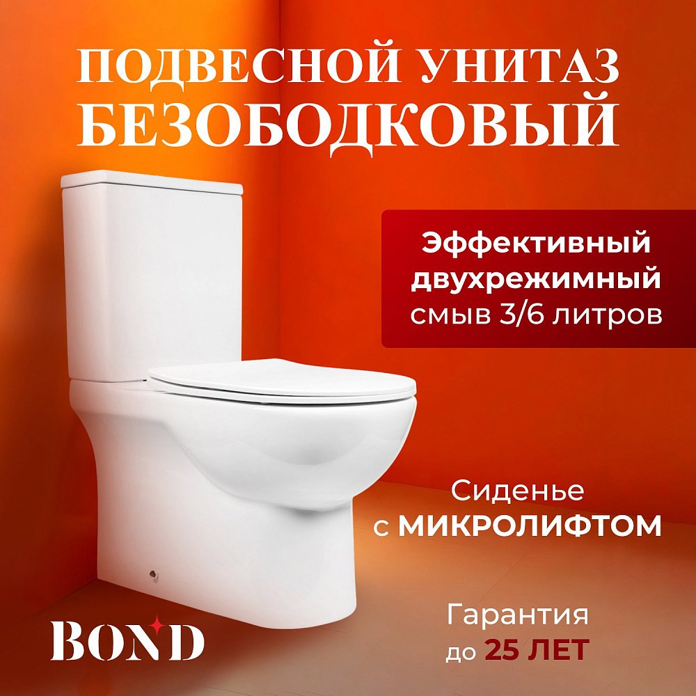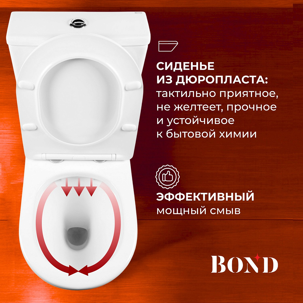 Унитаз-компакт BOND Oval F02-00 — это идеальное решение для современной ванной комнаты. Он сочетает в себе стильный дизайн, высокое качество и удобство использования. Этот напольный безободковый пристенный унитаз изготовлен из сантехнического фарфора, покрытого утолщённым слоем стекловидной глазури. Такое покрытие защищает изделие от скапливания бактерий и выцветания, придаёт блеск поверхности и обеспечивает лёгкий уход. Внешняя форма унитаза не позволяет скапливаться пыли, а внутренняя — безободковая — гарантирует простой уход и отсутствие неприятных запахов. Быстросъёмное сиденье сделано из дюропласта и имеет механизм плавного опускания — микролифт. Сиденье быстро и легко снимается, что обеспечивает удобство его мытья. У унитаза-компакта два режима слива: полный и экономный. Это позволяет рационально использовать воду и экономить ресурсы. Скрытый крепёж обеспечивает эстетический внешний вид унитаза, делая его гармоничной частью интерьера ванной комнаты. BOND Oval F02-00 — это не просто унитаз, это воплощение комфорта, стиля и функциональности. Он станет прекрасным дополнением к вашей ванной комнате и обеспечит вам долгие годы удовольствия от использования.