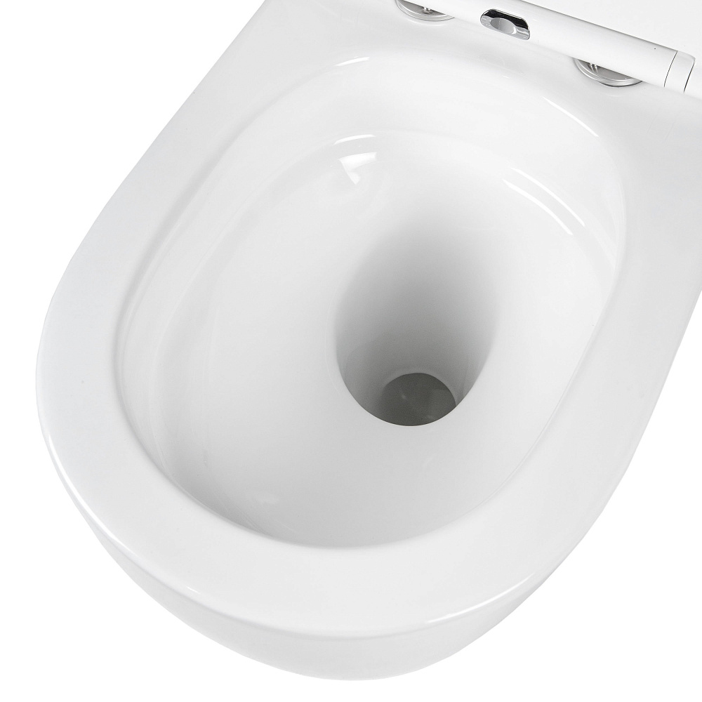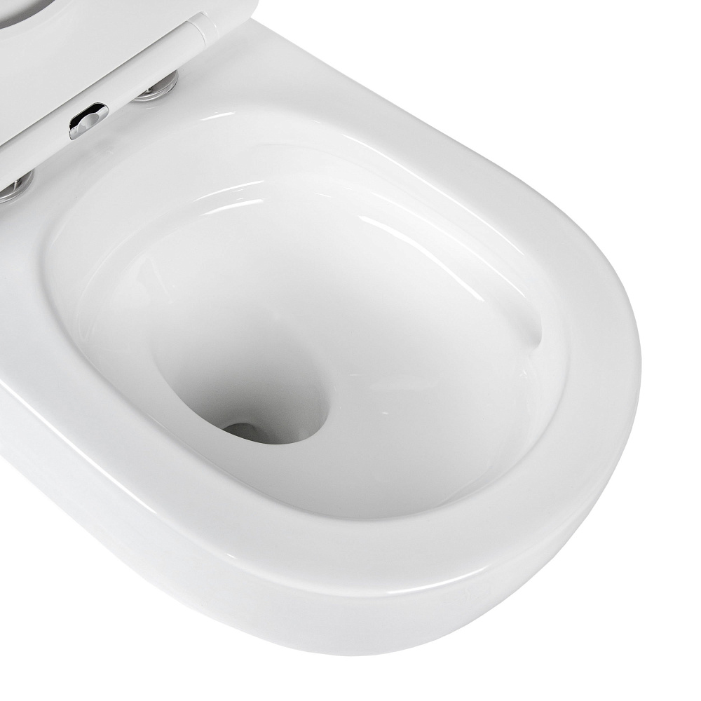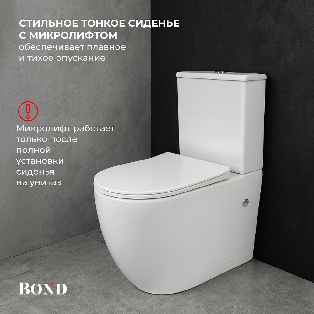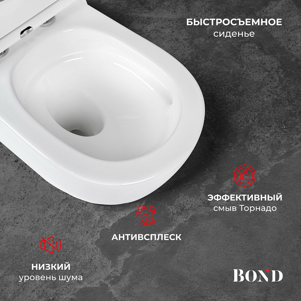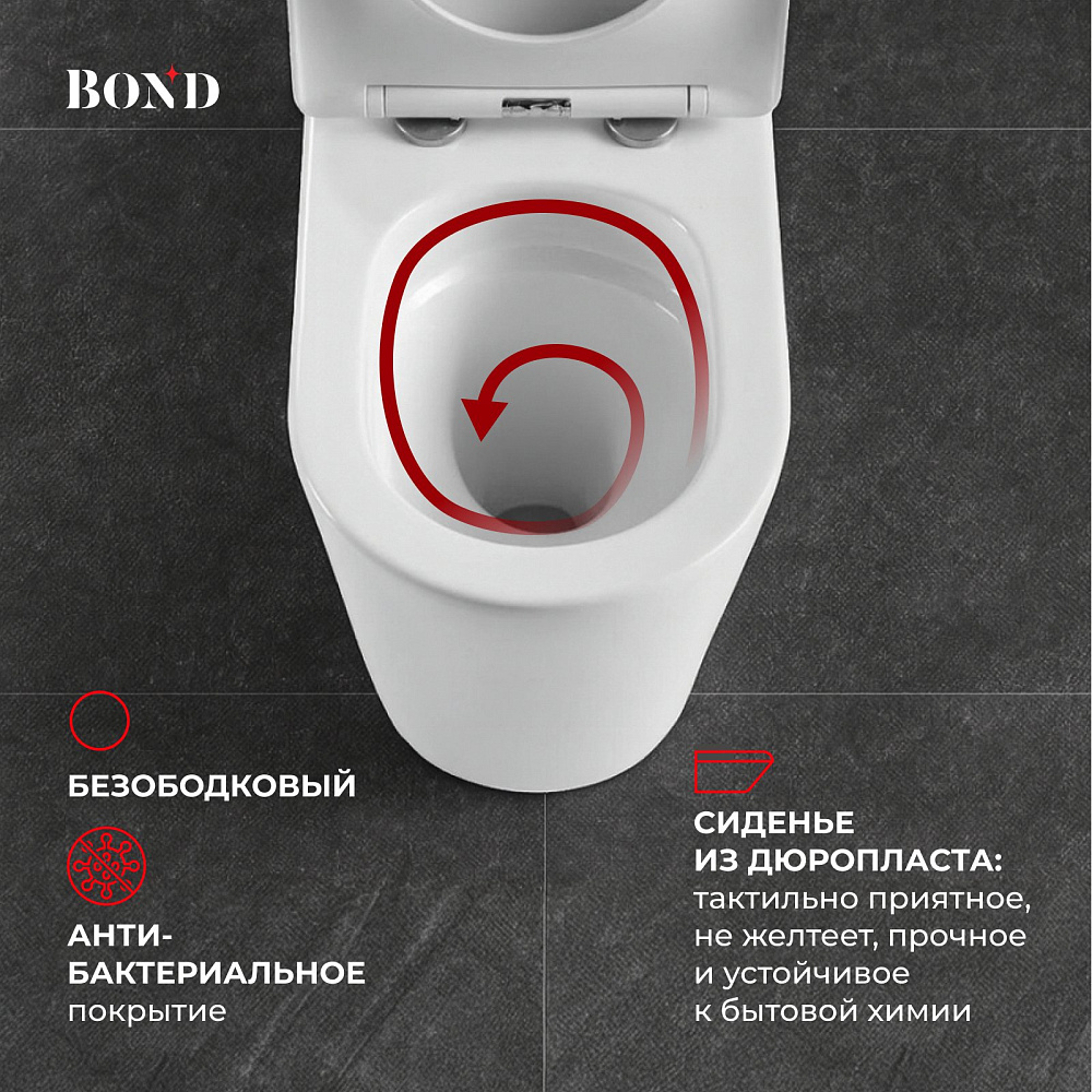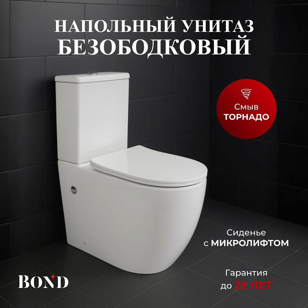 Напольный безободковый унитаз со смывом торнадо BOND Oval F12-00 отлично смотрится в современном интерьере. Он изготовлен из сантехнического фарфора, покрытого утолщенным слоем стекловидной глазури. Глазурь защищает изделие от скапливания бактерий и выцветания, придает блеск поверхности и обеспечивает очень легкий уход за ним. Скрытый крепеж обеспечивает эстетичный внешний вид.