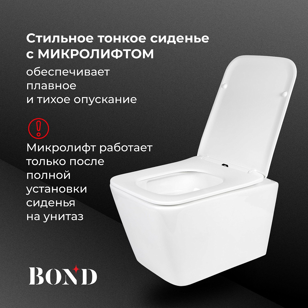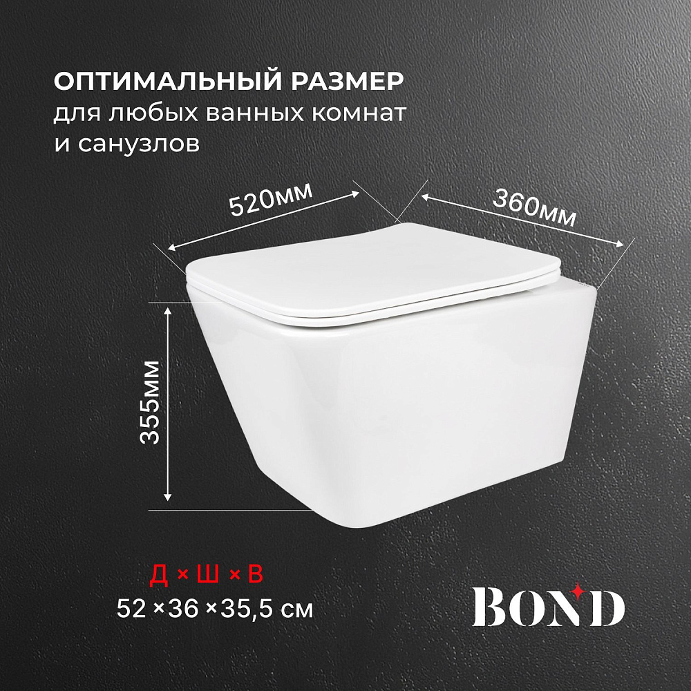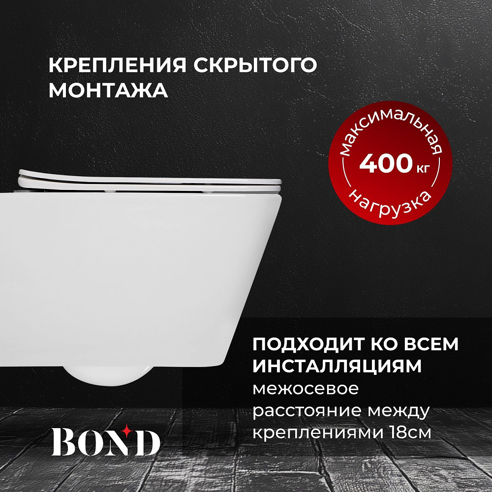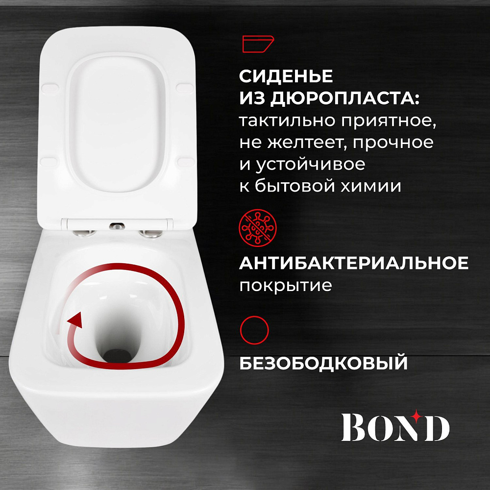 Подвесной унитаз с торнадо смывом безободковый BOND Oval F14-10 имеет стильный дизайн и отлично смотрится в современном интерьере ванной комнаты. Унитаз подвесной изготовлен из сантехнического фарфора, покрытого утолщенным слоем стекловидной глазури, которая защищает изделие от скапливания бактерий и выцветания, придает блеск поверхности и обеспечивает очень легкий уход за ним. Внешняя обтекаемая форма унитаза не позволяет накапливаться пыли, а внутренняя - безободковая - гарантирует простой уход и отсутствие неприятных запахов. Быстросъемное сиденье сделано из дюропласта и имеет механизм плавного опускания - микролифт; оно очень легко снимается, позволяя быстро и удобно помыть его. Унитаз имеет большую длину, на нем удобно сидеть, не задевая ничего внутри. Скрытый крепеж обеспечивает эстетический внешний вид. Унитаз со смывом торнадо имеет тихий слив, во время которого вода образовывает воронку-водоворот, омывая чашу на 360 градусов и смывая все необходимое с первого раза. Унитаз подвесной с торнадо смывом - отличное решение для покупки.