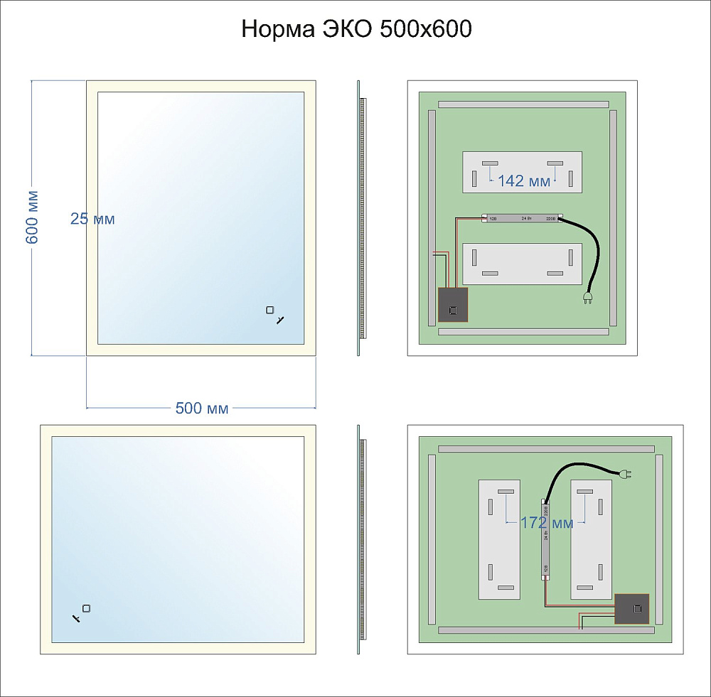 Зеркало MIXLINE "Норма" ЭКОНОМ 500*600 (ШВ) сенсорный выкл, светодиодная подсветка, универс.крепеж