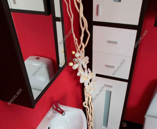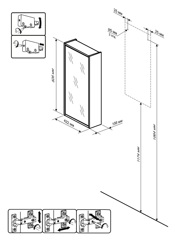 Зеркальное полотно дверцы шкафчика надежно прикреплено к основе из ЛДСП. Ручки нет. Открывается шкафчик с помощью отжимного устройства PUSH-UP.